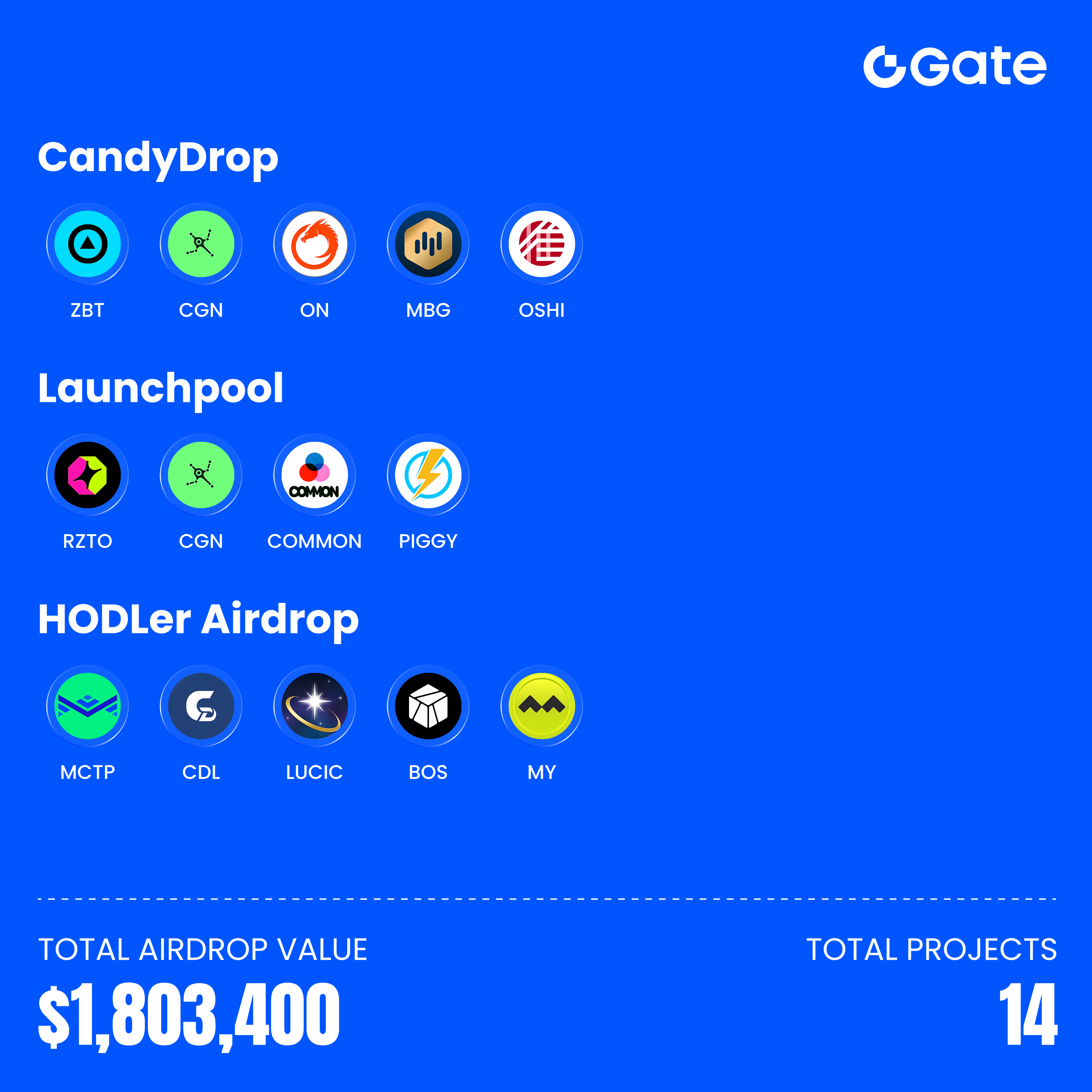 De 16 de outubro a 31 de outubro de 2025, a Gate lançou 21 novos projetos, 5 projetos CandyDrop, 4 projetos Gate Launchpool e 5 projetos HODLer Free Airdrop, com um valor total de airdrop de 1 803 400 $.
