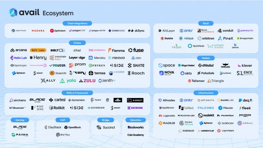 تقوم Avail بتشغيل مجموعة متنوعة من الأنظمة بجانب DA، بما في ذلك نظام Nexus للتشغيل البيني وطبقة Fusion للتوافق متعدد الأصول، لذا لديها العديد من المشاريع الشريكة، فقط من حيث الشركاء في DA: