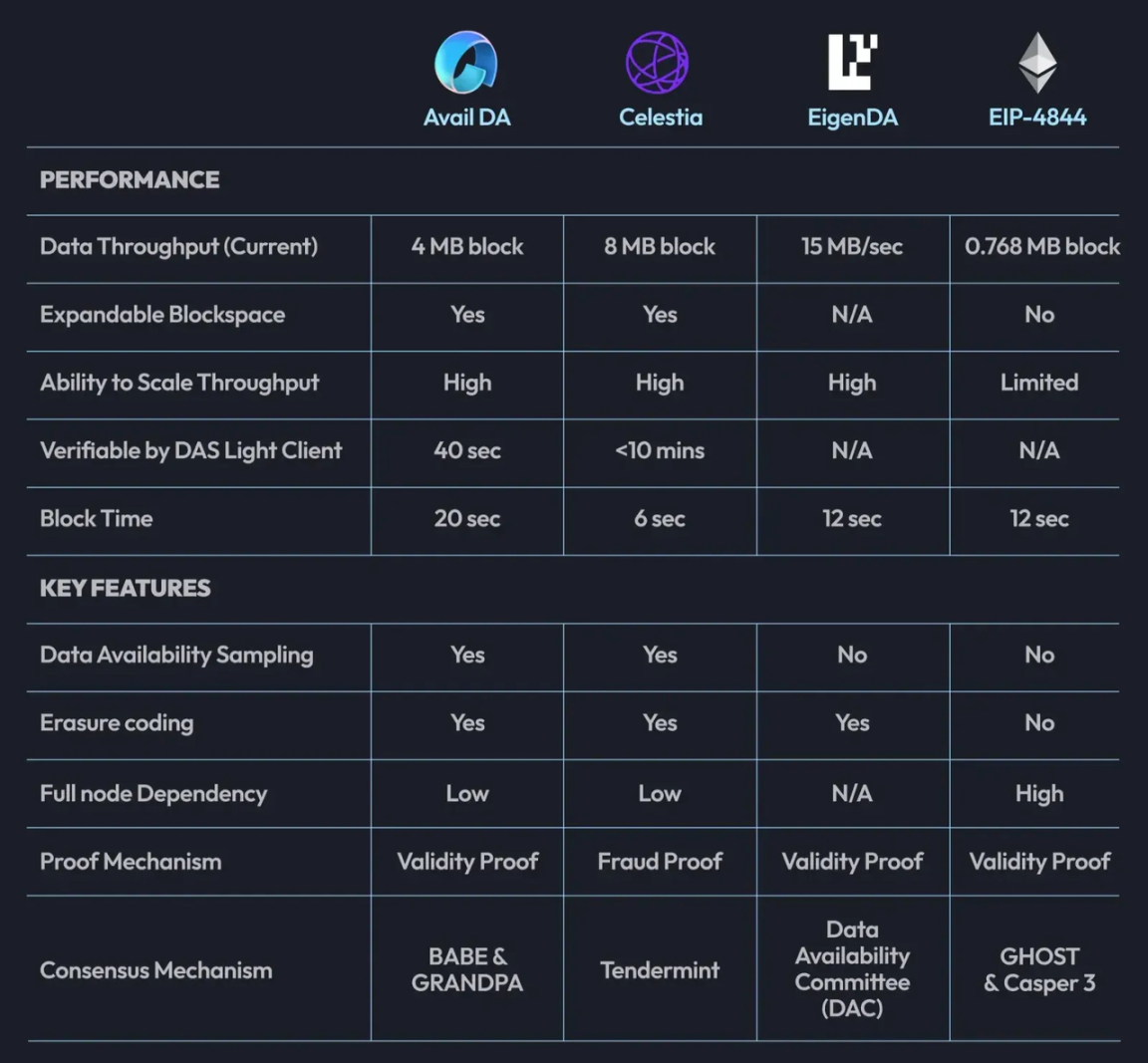 المتنافسون الرئيسيون في مجال DA الحالي، EigenDA و Celestia و Avail، يتطلعون بوضوح إلى تطوير السوق. على المدى القصير، من المتوقع أن تحقق الثلاثة مستويات مرضية من حيث الأداء والأمان من خلال استخدام الكتل الكبيرة و DAS بمعدل نقل بيانات عالي.