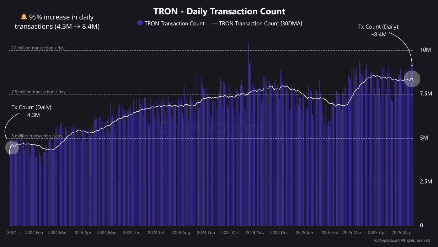 تاريخياً، حافظت TRON على أداء قوي في المعاملات، لكن معدل النمو الحالي ملحوظ. سجلت TRON 10.46 مليون معاملة في 24 أكتوبر 2024. كما شهدت 9.47 مليون معاملة في 15 مايو 2025. تظهر هذه الطفرات قدرة المنصة على التعامل مع أحجام الذروة دون انقطاع كبير. منذ فبراير 2025، ظل عدد المعاملات اليومية لـ TRON فوق 8 ملايين باستمرار. تشير هذه القاعدة الجديدة إلى أن الشبكة تحافظ على زخم مستدام.