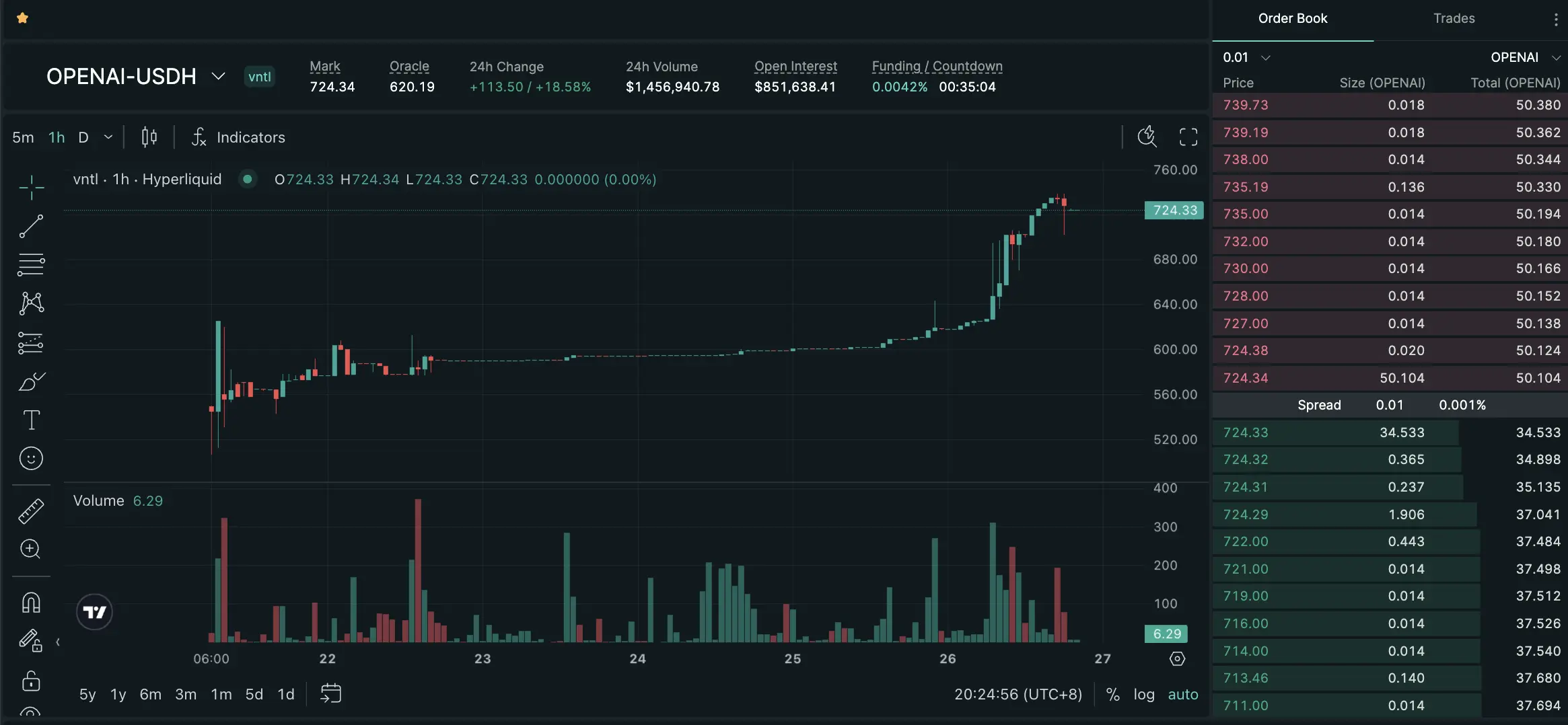 قبل أسبوع فقط، أطلقت Hyperliquid مباشرة زوج OPENAI-USDH للتداول. وهذا يعني أن شركة لم يتم طرحها للاكتتاب العام بعد، والتي يتم تحديد تقييمها بالكامل من قبل سوق الأسهم الخاصة، قد تم إدخالها في سوق على السلسلة يعمل 7×24، ويمكن الاستفادة منه بالرافعة المالية، ومتاح عالميًا، مما شكل ضغوطًا على الأصول الملموسة قبل الاكتتاب العام.