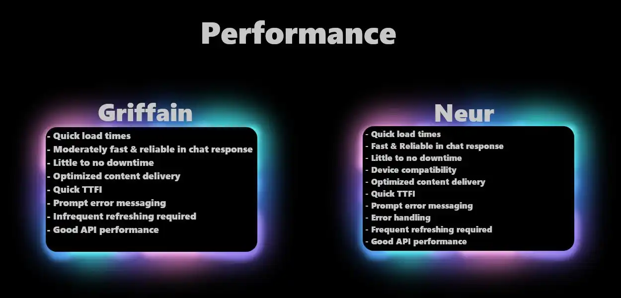 من الناحية الأدائية، Griffain و Neur كلاهما يظهران بشكل ممتاز، ولكن من الناحية العامة، يكون أداء Neur أفضل قليلاً. كما هو مذكور أعلاه، على الرغم من أن Griffain يوفر وظائف أكثر انتشارًا، إلا أن وظائف Neur أكثر دقة. وأبرز ما يميز Neur هو القدرة على تصحيح الأخطاء على الفور.