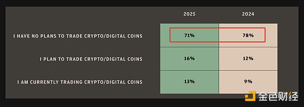 في الواقع ، أصبح اتباع الاستراتيجية أيضا خيارا لمزيد من المؤسسات. وفقا لأحدث استطلاع أجرته JPMorgan ، انخفض عدد المتداولين المؤسسيين الذين “ليس لديهم خطط” للمشاركة في تداول العملات المشفرة هذا العام إلى 71٪ من 78٪ العام الماضي. بمعنى آخر ، سيكون من الممكن إضافة 7٪ من المتداولين المؤسسيين إلى تداول العملات المشفرة في عام 2025. أي أن 29٪ من المتداولين المؤسسيين ربما بدأوا تداول العملات المشفرة هذا العام.