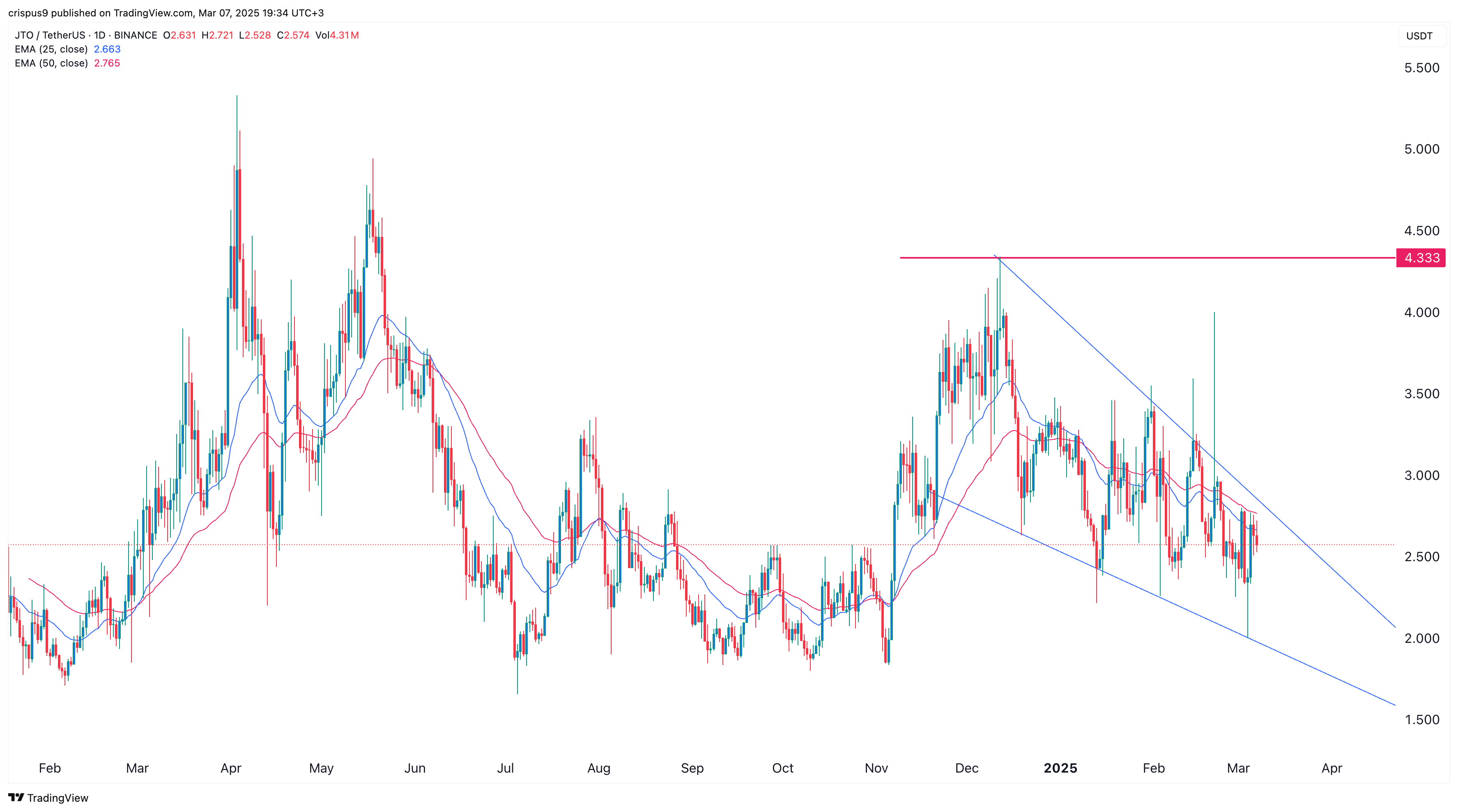 يوضح الرسم البياني اليومي أن سعر JTO تراجع في الأسابيع القليلة الماضية، حتى بينما ارتفعت إيرادات البروتوكول. انخفض من 4.3 دولار في ديسمبر إلى 2.5 دولار. حركت العملة قليلاً أدناه المتوسطات المتحركة الأسية لمدة 25 و 50 يومًا، علامة سلبية
