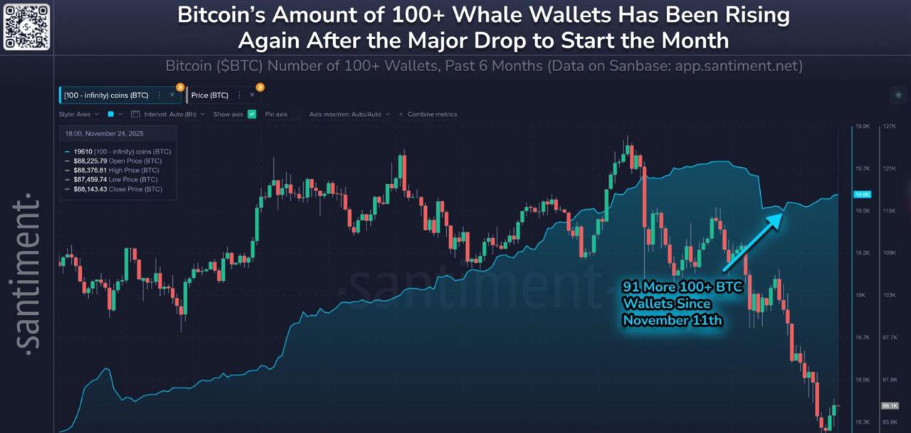 بعد الانخفاض، يراهن المحللون بالتساوي على استمرار BTC في مرحلة التراكم أو زيادة الطلب. يمكن أن تكون التوقعات الأخيرة صحيحة حيث أظهرت البيانات أن عدد المحافظ التي تحتوي على حد أدنى من 100 بيتكوين قد زاد بنسبة 0.47% منذ أوائل نوفمبر.