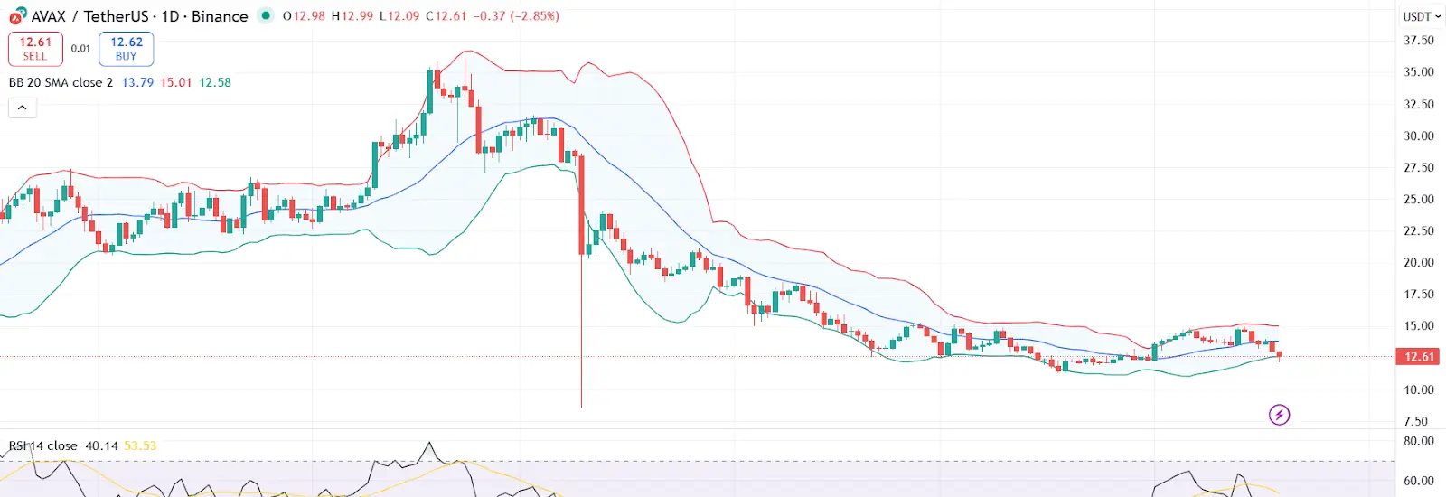 على الرسم البياني اليومي، تتداول AVAX أسفل منتصف نطاق بولينجر لمدة 20 يومًا. اختبرت السعر مؤخرًا الحد الأدنى بالقرب من 12 دولار، وهو منطقة مرتبطة بزيادة ضغط البيع على المدى القصير. فشل في الحفاظ على $12 قد يؤدي إلى انخفاض محتمل نحو 10.50 دولار.