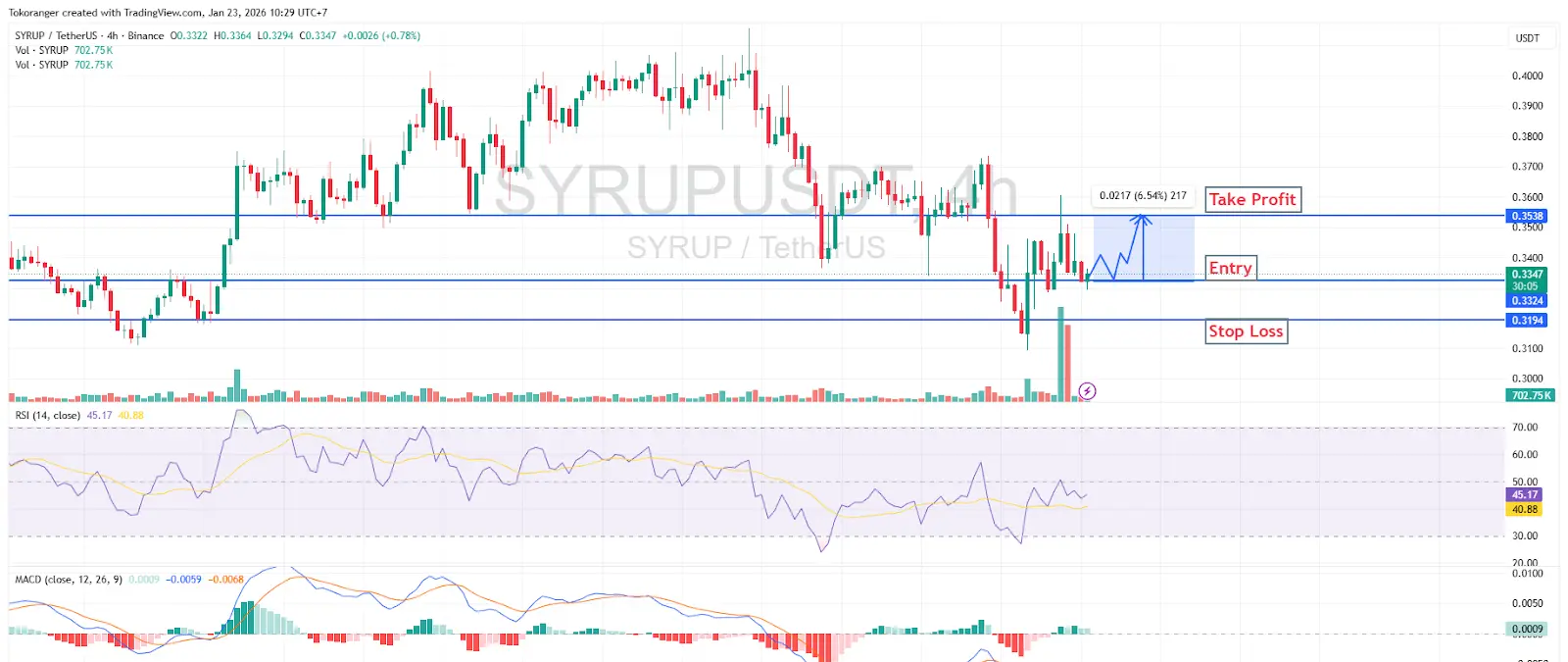 SYRUP/USDT (إطار زمني 4 ساعات) حاليًا يشهد ارتفاعًا طفيفًا، لكن احتمالية التصحيح لا تزال قائمة، لذا يجب مراقبة الحركة. حجم التداول يبدو متزايدًا، لكن تقلباته صغيرة نسبيًا، مما يجعل الدفع الصاعد غير قوي جدًا.