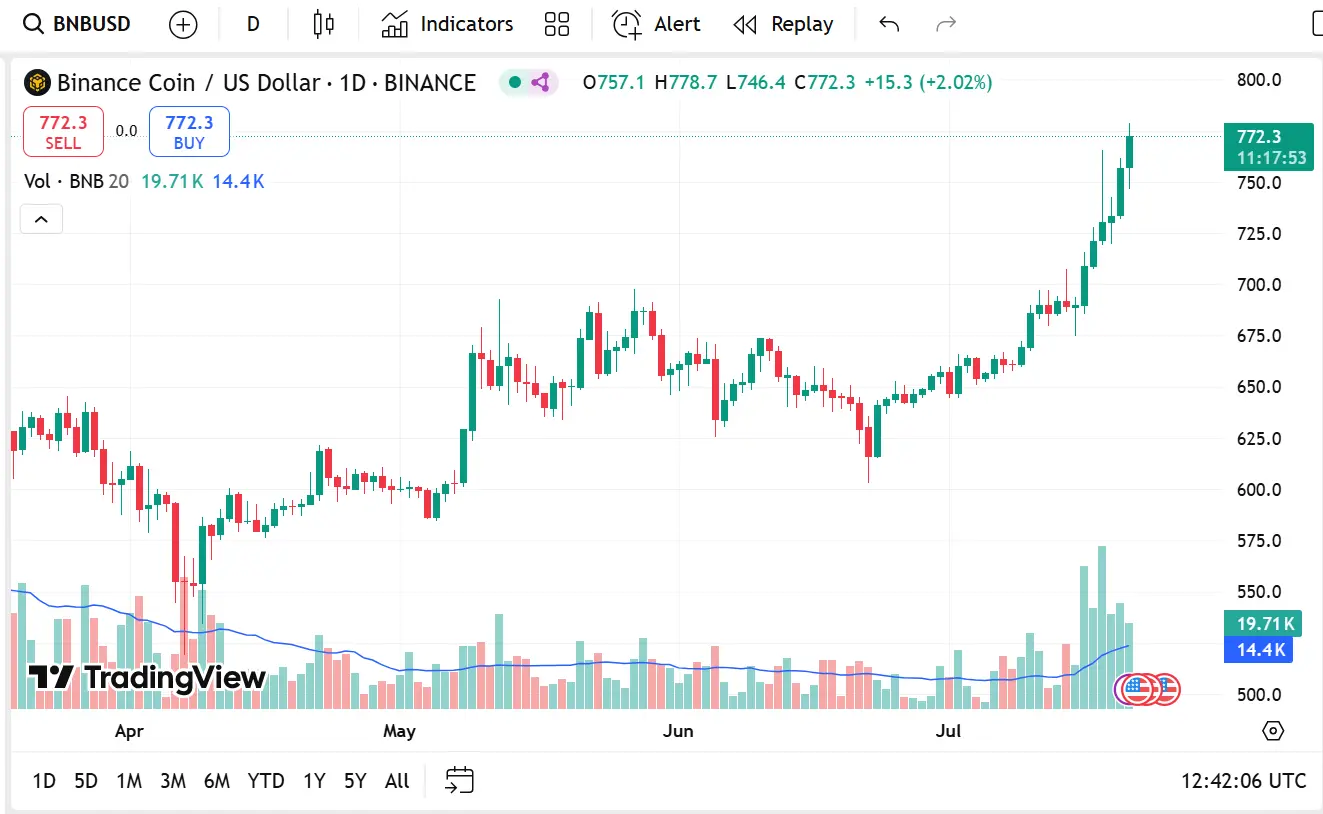 Siguiendo la noticia, Binance Coin (BNB) está viendo un ligero aumento. Hoy, BNB se vende a $769.89, un incremento del 3.01%, con la capitalización de mercado en $107.23 mil millones y el volumen aumentando un 30.29% a $2.68 mil millones (Binance Coin).
