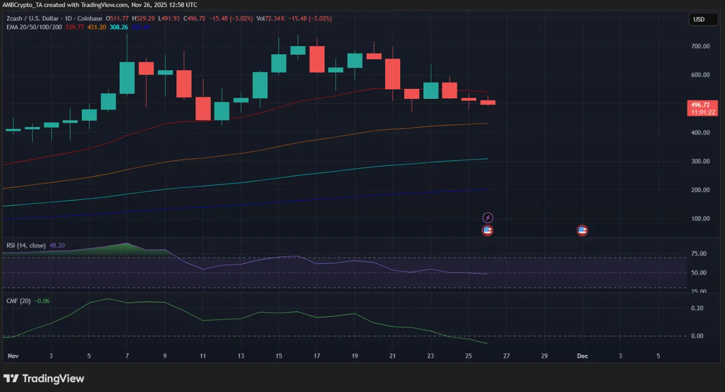 En el momento de la grabación, ZEC se está negociando alrededor de 496 USD, prolongando la caída de más del 20% en la última semana.