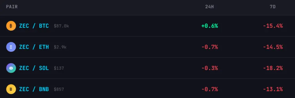 Los datos más recientes muestran que la psicología de “evitar riesgos” está dominando el mercado de manera bastante clara. En pares de negociación importantes como BTC, ETH, SOL y BNB, ZEC ha caído entre un 13 y un 18% en solo una semana, reflejando la debilidad relativa de esta moneda en comparación con el promedio.