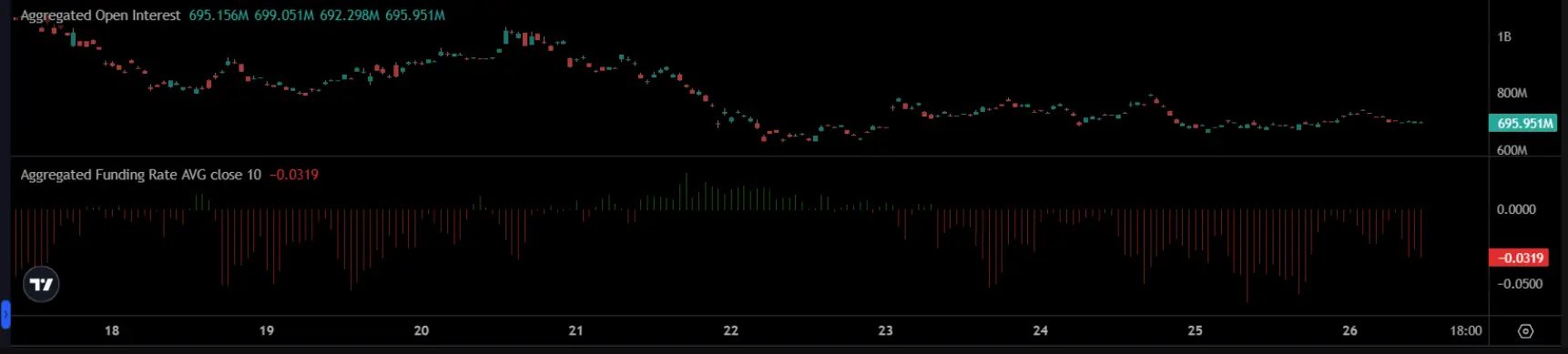 Fuente: CoinalyzeEn el mercado de futuros, el contrato abierto (OI) solo se ha reducido ligeramente y sigue anclado en el umbral de 695 millones USD, lo que indica que los comerciantes no tienen prisa por cerrar todas sus posiciones. Mientras tanto, la tasa de financiamiento se mantiene en un nivel negativo, reflejando una inclinación hacia las órdenes Short, pero aún no han aparecido signos de un aumento drástico en el apalancamiento.