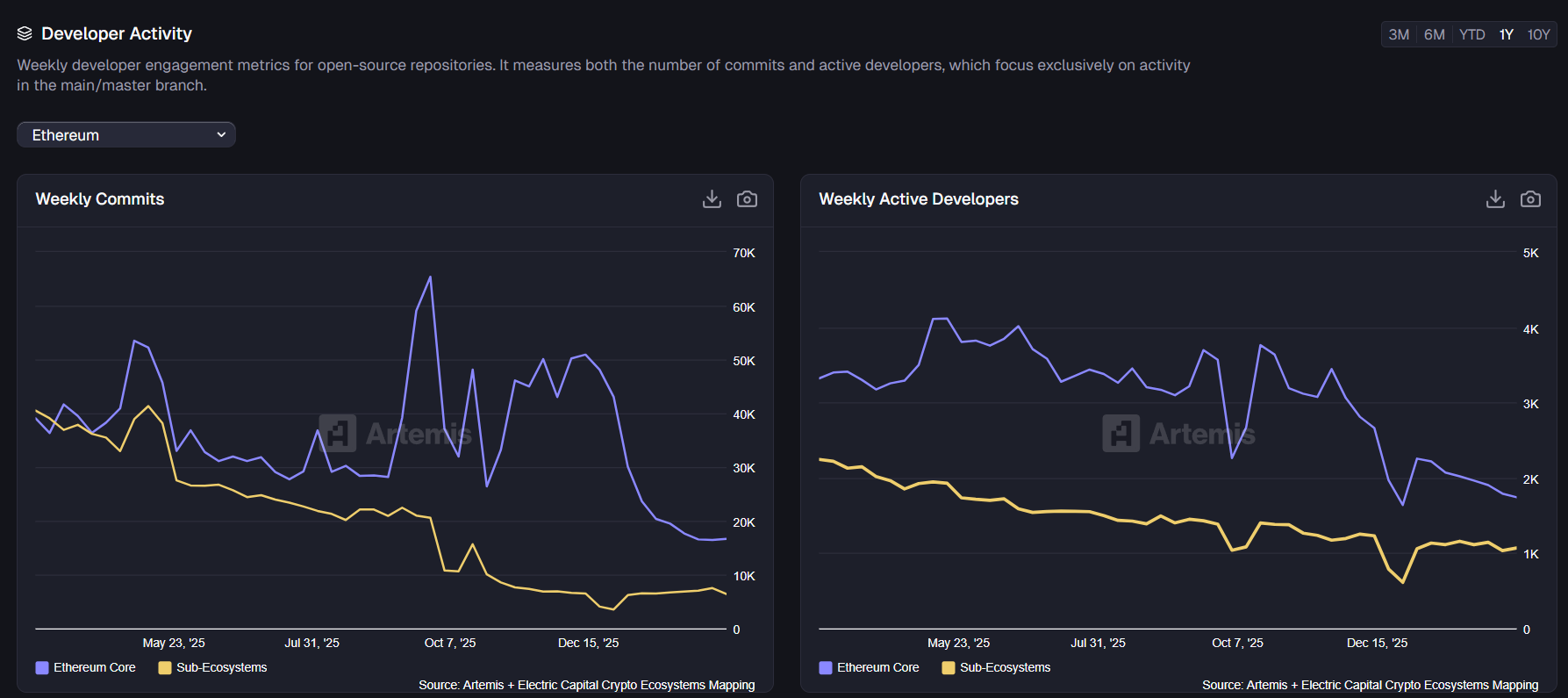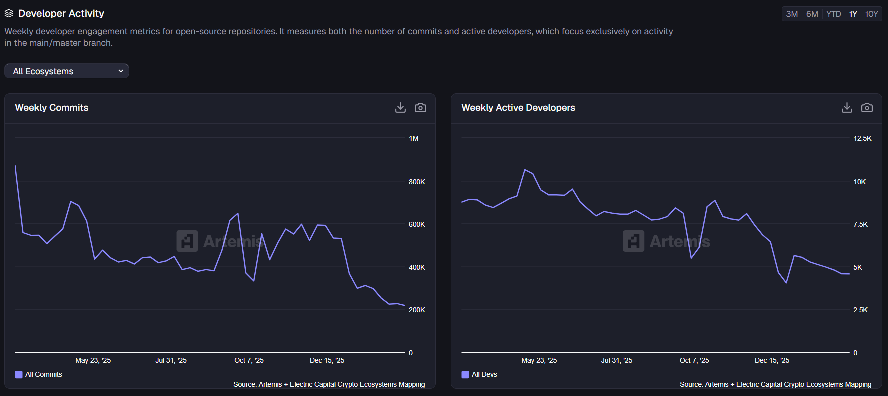 據《CoinDesk》報導,Artemis 的數據顯示,自 2025 年初以來,加密貨幣專案的每週程式碼提交量大幅下滑約 75%,從原先的 85 萬次降至 21 萬次,活躍開發者人數也減少了 56%,降至約 4,600 人。