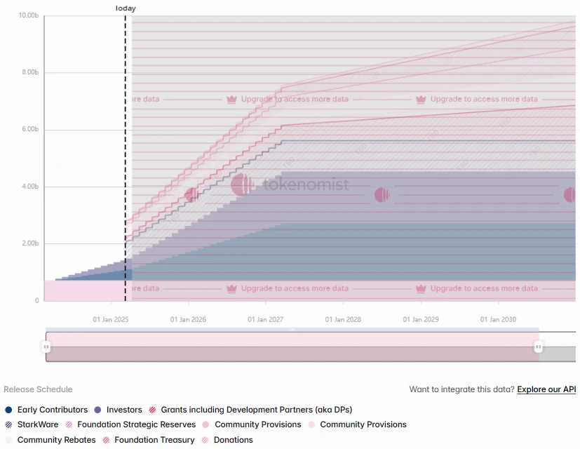 El precio de STRK ha caído más del 90% desde sus máximos y todavía se está desbloqueando a un ritmo alto, con los primeros contribuyentes desbloqueando 33.57 millones de piezas por valor de unos 5.94 millones de dólares y los inversores desbloqueando 30.43 millones de piezas por valor de unos 5.39 millones de dólares.