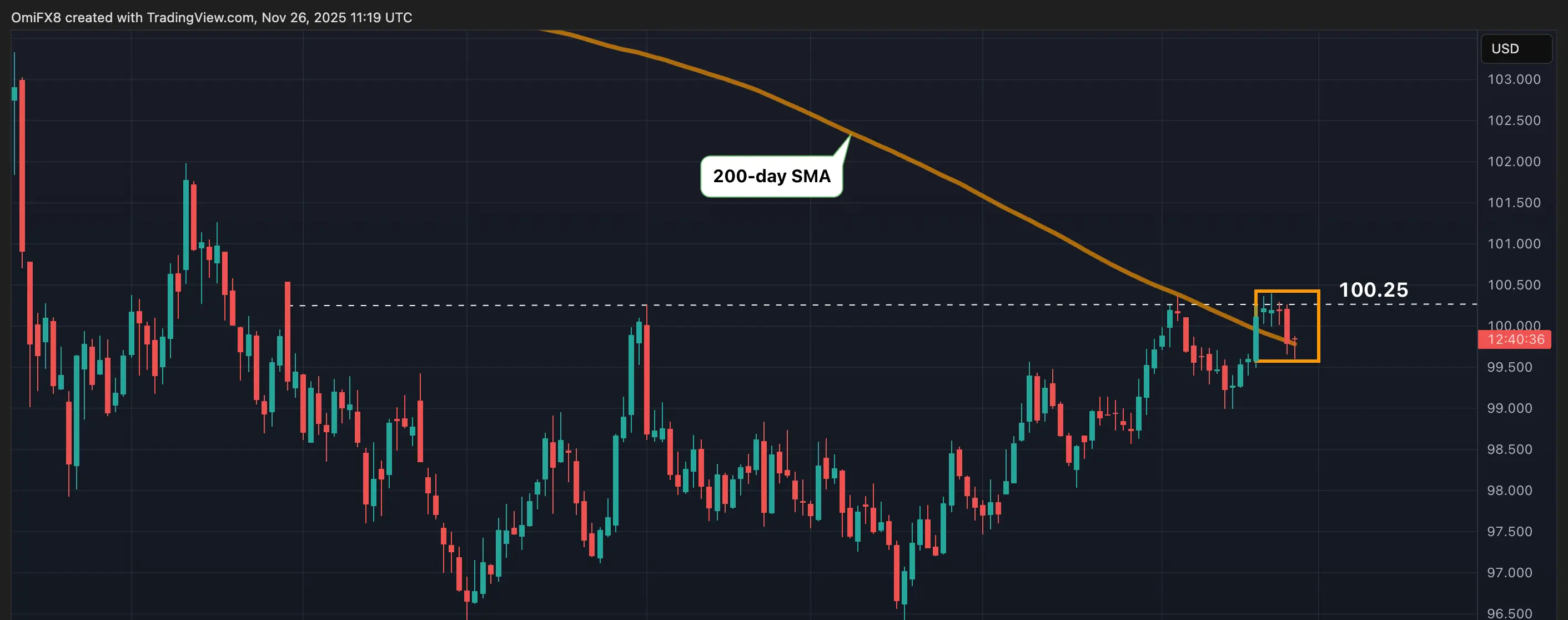 Los movimientos diarios del índice del dólar muestran que el índice busca establecer una base por encima de su promedio móvil simple de 200 días (SMA) a pesar de la serie de datos económicos débiles de EE. UU., incluyendo las nóminas ADP, y el fuerte aumento en las probabilidades de recorte de tasas de la Fed en diciembre. Es un escenario clásico alcista: un mercado que ignora las malas noticias, lo que a menudo señala que un gran repunte podría estar en el horizonte.