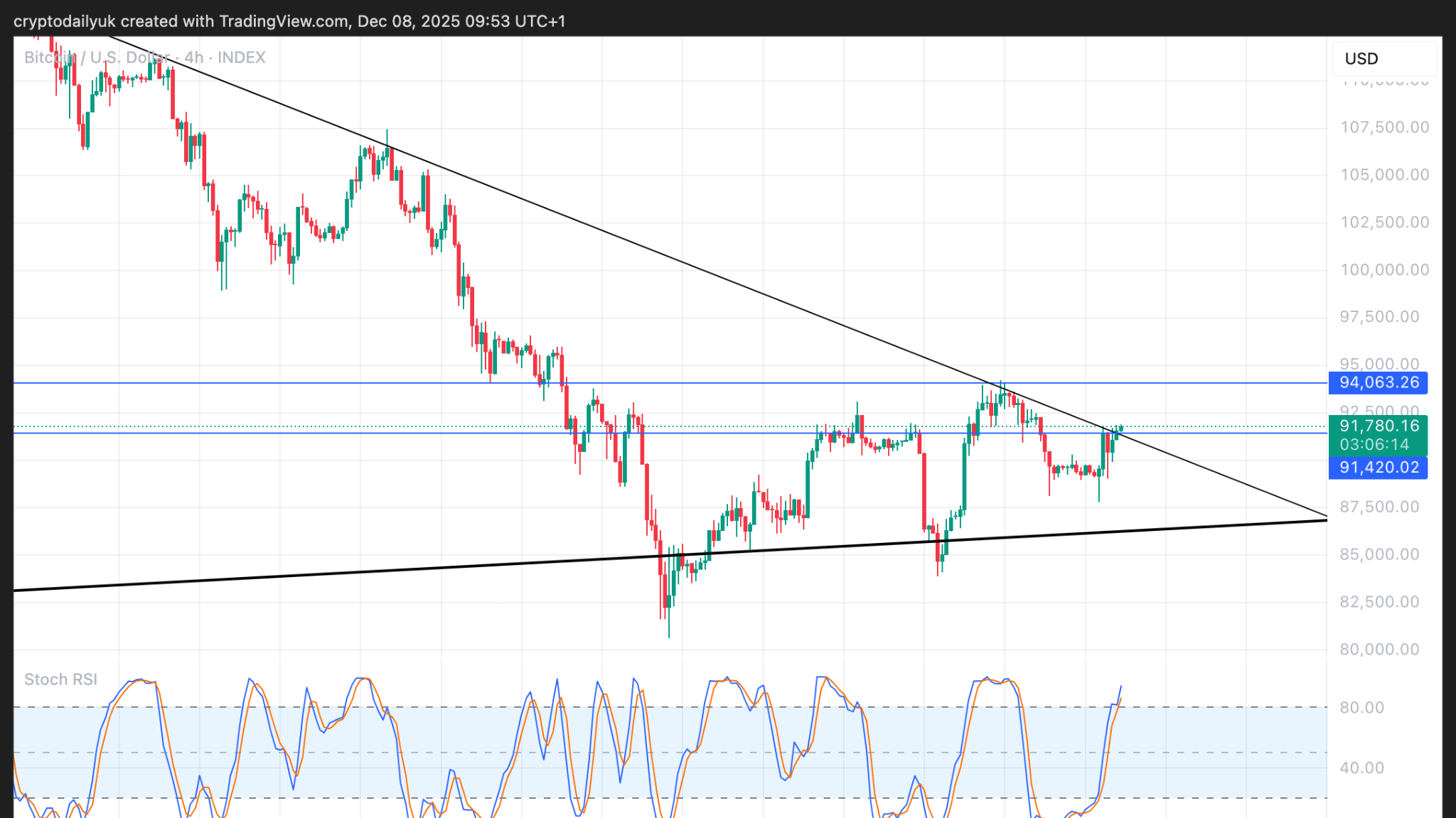 Aunque todavía es pronto para afirmarlo, BTC acaba de abrir una nueva vela de 4 horas por encima de la línea de tendencia descendente. No solo ha hecho esto, sino que el precio también ha superado el nivel de resistencia horizontal de 91.400$. Mientras el precio se mantenga por encima de estos dos importantes hitos de resistencia, el siguiente paso lógico sería un movimiento al alza hasta la siguiente resistencia horizontal en 94.000$.