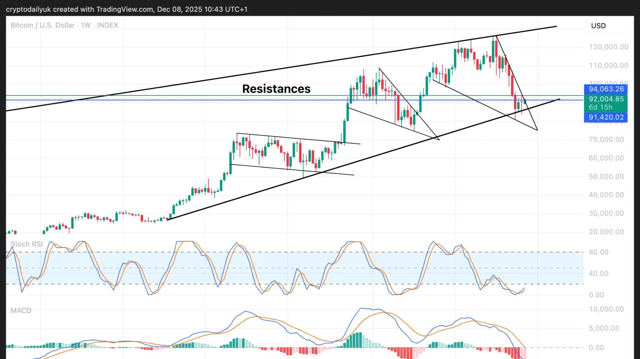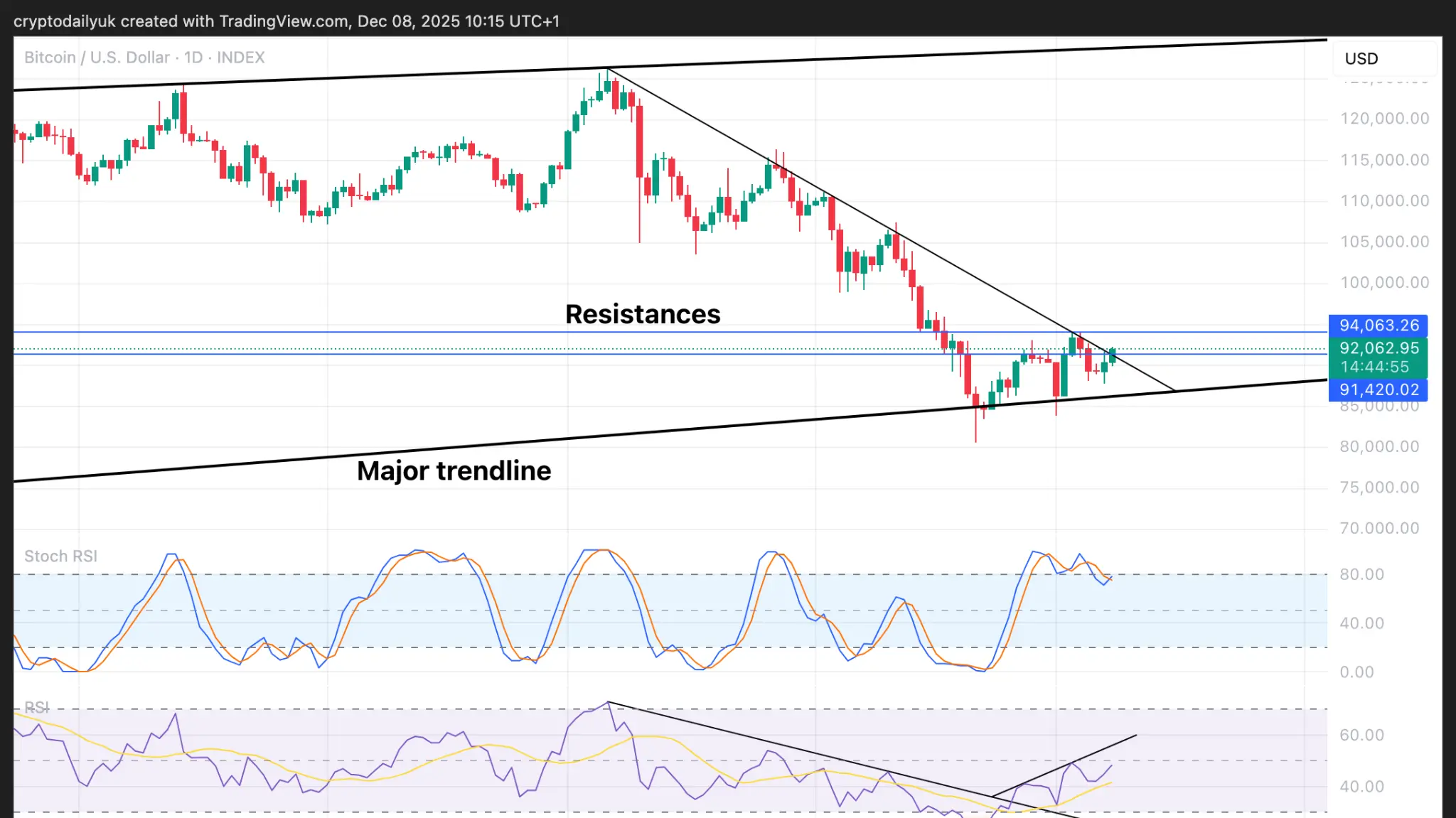 En la parte inferior del gráfico, el RSI revela que la línea del indicador está volviendo a subir, tras haber tocado fondo cuando la acción del precio también alcanzó su mínimo en 80.000$. Esto bien podría ser la próxima ola de regreso a la cima.