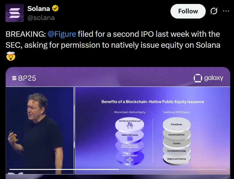 Fuente: CryptoNewsNet Título original: Figure Technology presenta ‘segunda OPV’ para traer emisión de acciones nativas a Solana Enlace original: Figure Technology, una compañía de servicios financieros basada en blockchain enfocada en activos tokenizados y préstamos, ha presentado una segunda oferta pública destinada a emitir acciones nativas directamente en una cadena de bloques pública. La medida, que sigue a la reciente cotización de la compañía en Nasdaq, está diseñada para expandir los casos de uso de finanzas descentralizadas (DeFi) en Solana.