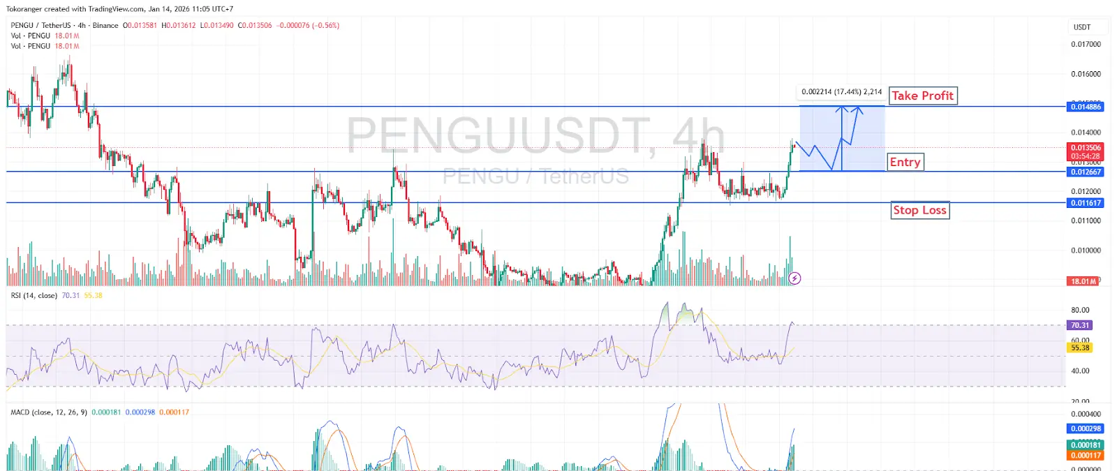 Esta condición también se confirma con volumen de transacción relativamente alto, indicando que el interés del mercado está en aumento. Con esta estructura, PENGU podría continuar subiendo hacia el objetivo de 0,014886, con entrada en 0,012667 y stop loss en 0,011617, siempre que el soporte se mantenga.