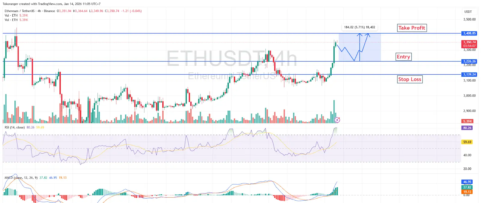 Para la estrategia de trading, la entrada sería en 3.226, stop loss en 3.139, y tomar ganancias en 3.408, con un potencial de subida de aproximadamente 5,71%, anticipando una corrección a corto plazo antes de que continúe la subida.