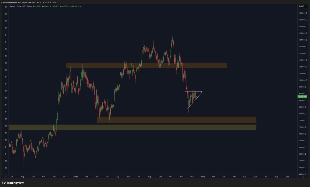 Por otro lado, una ruptura desde el triángulo volvería a desplazar el impulso hacia arriba. En ese escenario, la primera zona de reacción importante se sitúa entre $103,000 y $107,000. Esta región limitó múltiples rallies a lo largo del trimestre y recuperarla representaría una mejora significativa en la estructura del mercado. Crypto Rover enfatiza que este es el nivel que los traders deben vigilar si comienza una aceleración al alza.