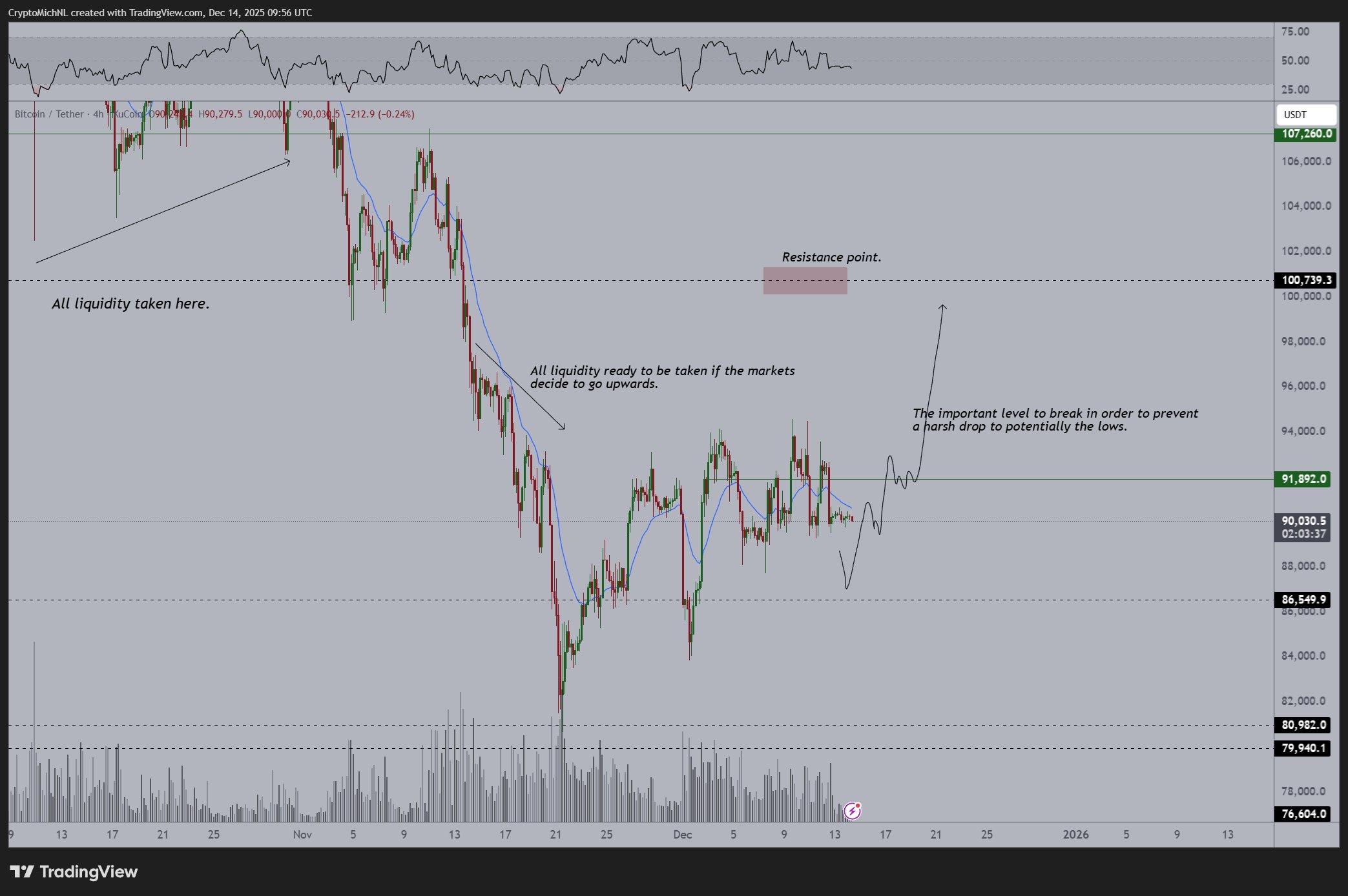 También recalca que el volumen bajo reciente está creando una acción del precio inestable. A pesar de ello, se mantiene seguro de que pronto surgirá una dirección más clara, y cree que el movimiento decisivo probablemente ocurrirá durante la semana que viene. Su gráfico describe un escenario en el que primero se toma la liquidez por debajo de los mínimos recientes, seguido de una recuperación hacia una resistencia alrededor de $100,700, siempre que Bitcoin pueda sostener la zona de los $90,000 a medio camino.