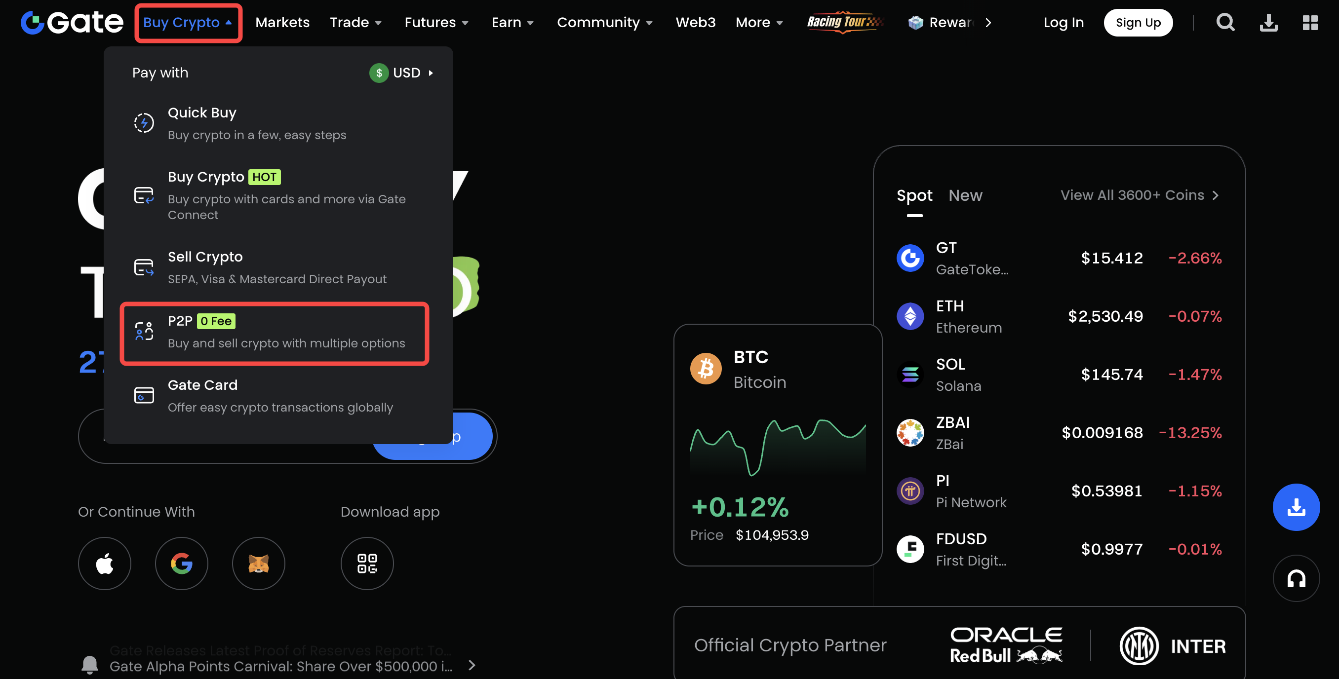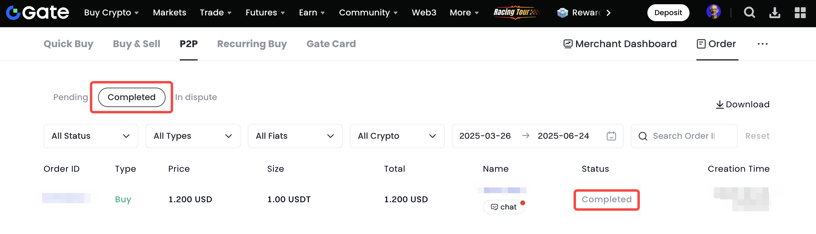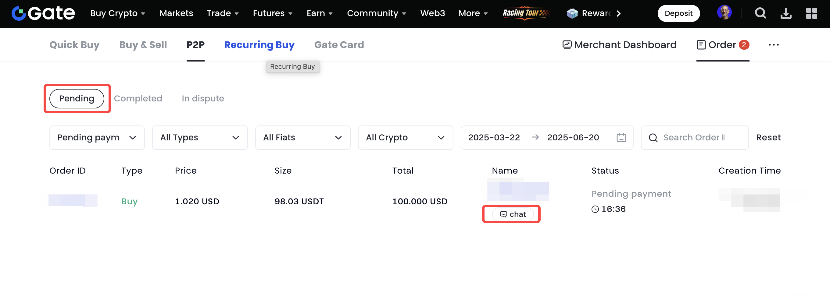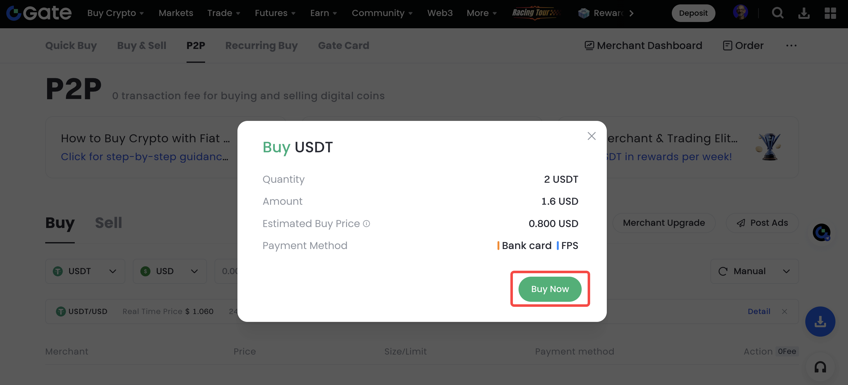 1. Connectez-vous à votre compte Gate, passez sur l'onglet "Acheter des Cryptos", et cliquez sur le lien "Transaction P2P".