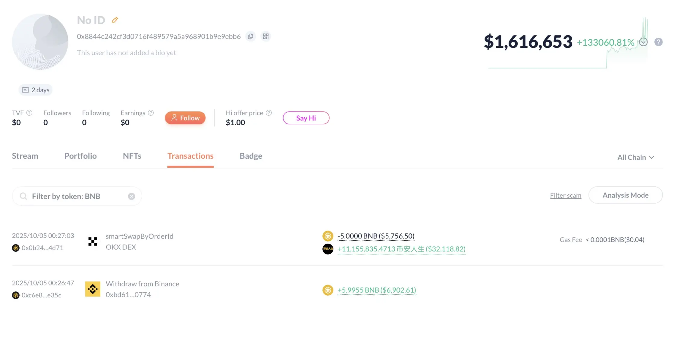 Même les nouveaux venus, grâce à des mises importantes et à du courage, ont obtenu des rendements élevés. L'adresse 0x505…4e933 a dépensé 124 000 dollars pour acheter « Binance Life » au prix moyen de 0,00696 dollars, qui vaut désormais plus de 1,4 million de dollars, avec un rendement supérieur à 19 fois.
