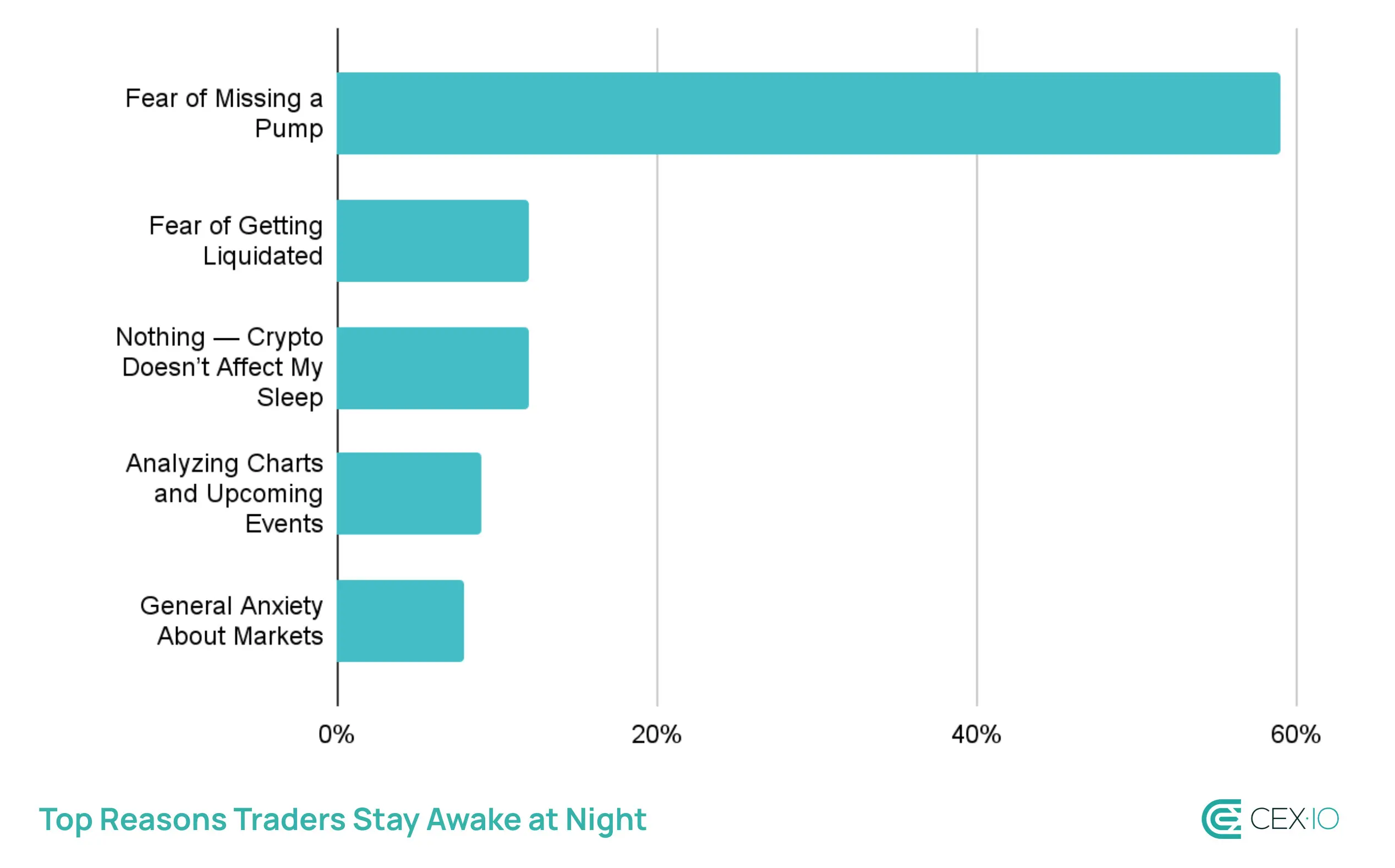 Pendorong emosional memainkan peran besar. Pelaku utama tampaknya bukan ketakutan akan kerugian tetapi ketakutan akan kehilangan peluang: 59% mengatakan bahwa ketakutan akan kehilangan pompa membuat mereka terjaga lebih dari yang lainnya. Risiko likuidasi, kecemasan pasar umum, dan analisis grafik mengikuti jauh di belakang.