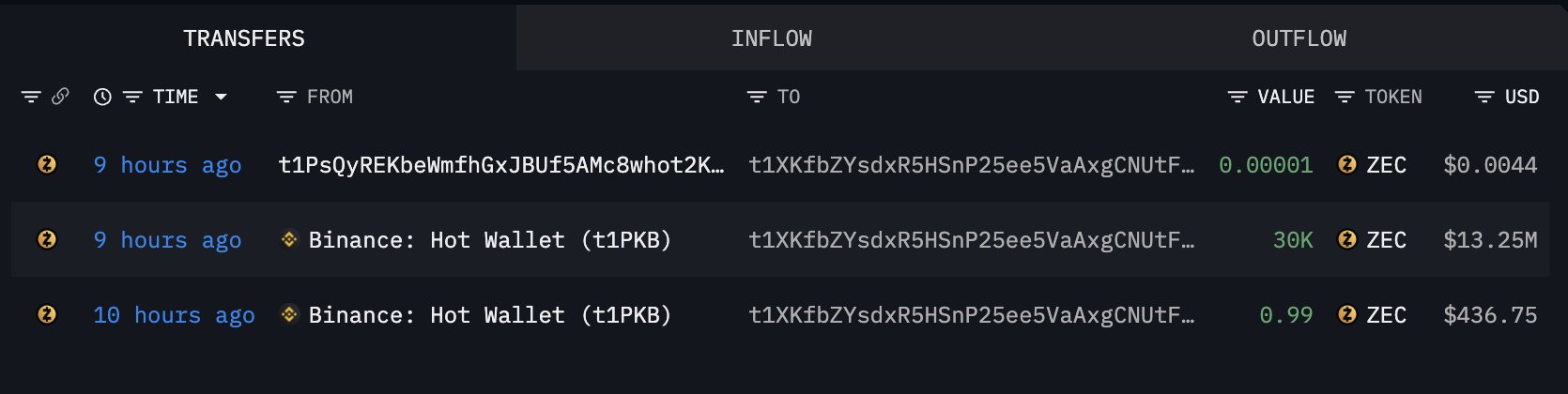 Data on-chain mulai mendukung narasi bullish. Menurut data yang dibagikan oleh Lookonchain, sebuah dompet yang baru dibuat (t1XKfb) menarik 30.000 ZEC senilai sekitar $13,25 juta dari Binance hanya sembilan jam yang lalu. Penarikan besar seperti ini biasanya mengurangi tekanan jual langsung di bursa dan sering kali menandakan akumulasi jangka panjang daripada spekulasi jangka pendek.