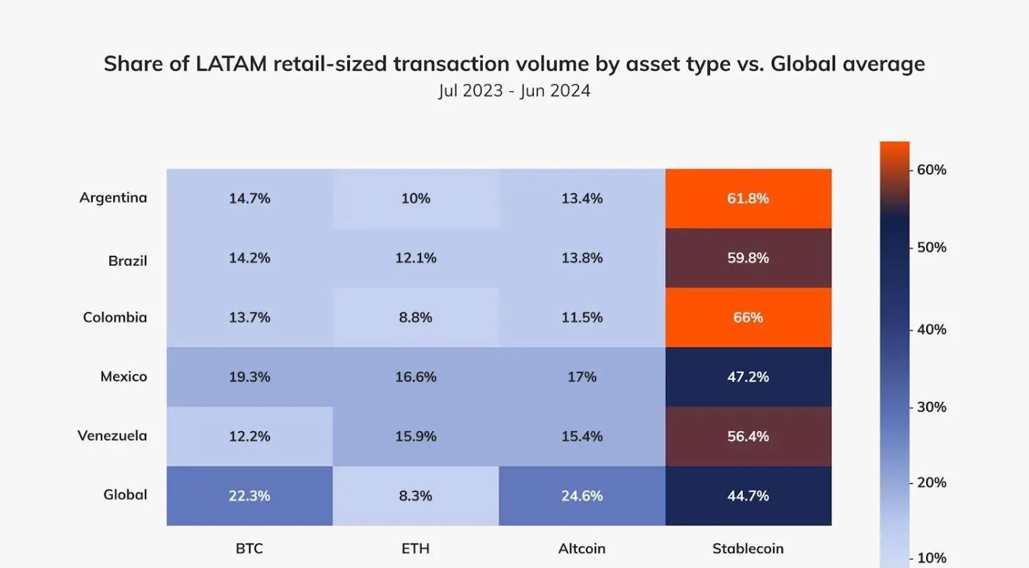 Stablecoin telah melihat lonjakan popularitas yang paling signifikan, dengan data Chainalysis menunjukkan bahwa Amerika Latin memimpin dunia dalam adopsi stablecoin, dengan trader di Argentina, Brasil, dan Kolombia mencatatkan pangsa transaksi stablecoin masing-masing sebesar 61%, 59%, dan 66% pada tahun 2024.