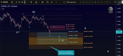 Pergerakan saat ini pada grafik SUI dipandang sebagai potensi gelombang 4 dalam penurunan gelombang C yang lebih besar. Karena gelombang C yang lengkap memerlukan struktur lima gelombang penuh, grafik ini kekurangan satu rendah lagi sebelum dasar yang lebih dapat diandalkan dapat terbentuk. Interpretasi ini tetap konsisten kecuali aksi harga membuktikan sebaliknya.