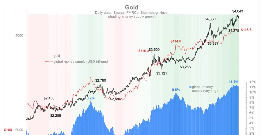 Emas terus naik seiring dengan bertambahnya pasokan uang global, yang saat ini sekitar $116,5 triliun dan tumbuh sekitar 11,4% per tahun. Timmer menunjukkan bahwa keselarasan emas dengan tren likuiditas tetap utuh, membantu menjelaskan mengapa rally-nya terlihat tertib dan berkelanjutan daripada spekulatif.