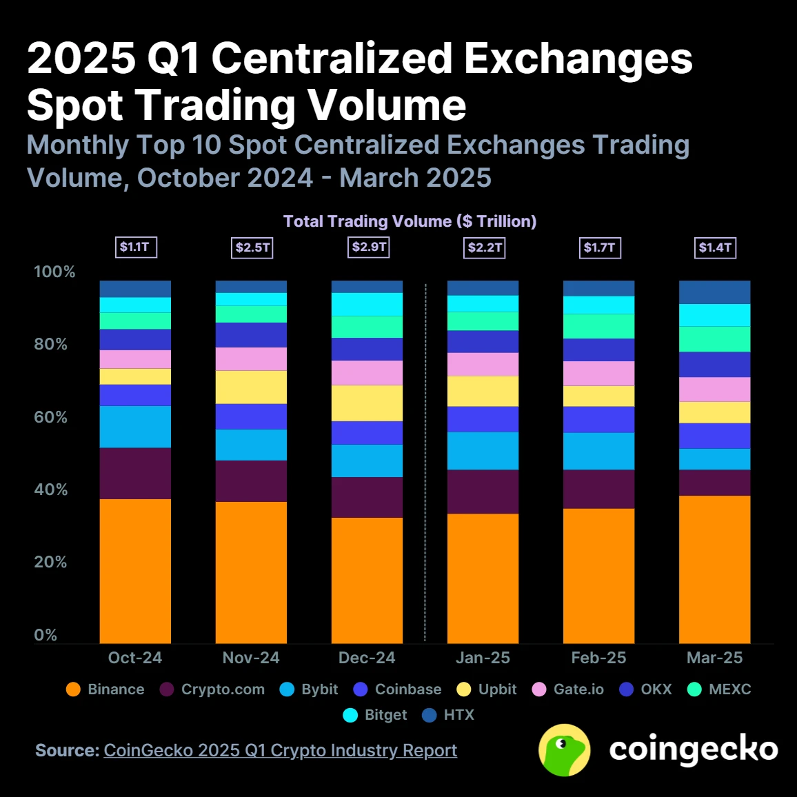 バイナンスの市場支配力は、その最も目立つラベルの一つです。Coingecko の2025年第1四半期の暗号業界レポートによれば、世界のトップ10の中央集権取引所の現物取引量は5.4兆ドルに達し、前期比で16.3%の減少にもかかわらず、バイナンスは40.7%の市場シェアで首位を維持し、前四半期比で約5%の上昇を見せました。この成果は、市場の高度な信頼を反映しているだけでなく、取引マッチングシステムと流動性管理における絶対的な優位性を示しています。