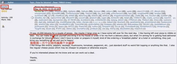 2010年5月18日午前12時35分、IDがLaszloのユーザーがビットコインフォーラムに報奨金の投稿を投稿し、10,000ビットコインを2つの大きなピザと交換することを提案し、売り手は自分で作るか、テイクアウトを注文することができました。 以前、4月16日には、ビットコインの創設者であるサトシ・ナカモトが立ち上げたフォーラムであるビットコイントークフォーラムに参加しました。
