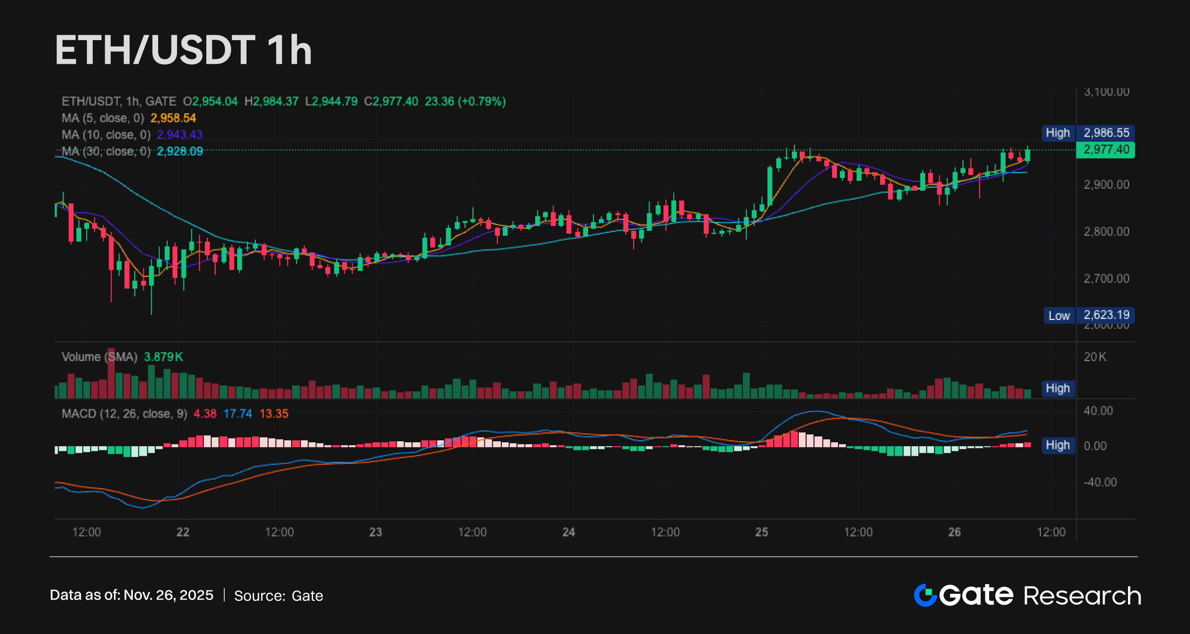 ETHは2,900ドル付近で下げ止まった後、25日の夜に強力に反発し2,980–3,000ドルの範囲に達し、短期的な感情が改善しました。移動平均線の観点から、MA5とMA10は常にMA30の上に位置しており、構造は比較的健康で、反発のエネルギーが安定していることを示していますが、2,950–2,980ドルの範囲に持続的に留まることができるかどうかを観察する必要があります。これにより、ブルの強さを確認します。MACDの赤いバーは25日に明らかに拡大し、その後は緩やかになり、短期的な買いが介入したことを示していますが、その力はさらに拡大していません。もしETHが2,950ドルを保持できれば、強気の振幅パターンを維持します。もし2,900ドルを割り込むと、価格が2,850ドル以下の領域を再度テストする可能性に注意が必要です。