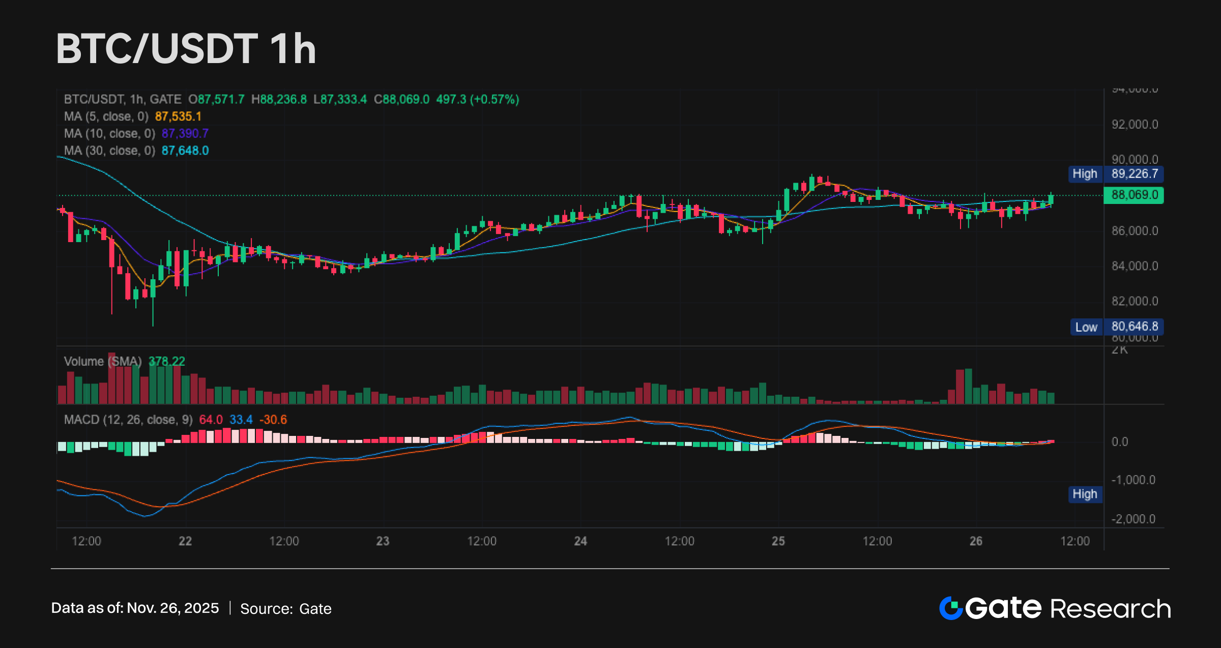 BTCは86,000ドル付近でサポートを得た後、市場全体とともに小幅に回復し88,000–89,000ドルの範囲に達し、短期的な構造が徐々に安定しました。移動平均線に関しては、MA5とMA10がMA30の上で安定して運行しており、価格が穏やかな修正ペースを維持していることを示していますが、全体としては明確なトレンド突破信号が欠けており、価格が88,000ドルの上で持続的に安定できるかどうかを観察する必要があります。MACDの赤い柱は25日に明らかに拡大しましたが、その後徐々に収束し、短期的な買い圧力は強まったものの、市場の追随意欲は依然として限られていることを示しています。もしBTCが87,500–88,000ドルを安定して守ることができれば、横ばい上昇構造が継続する可能性があります。しかし、87,000ドルを下回ると、再度85,000ドル付近のサポートゾーンをテストする可能性があります。