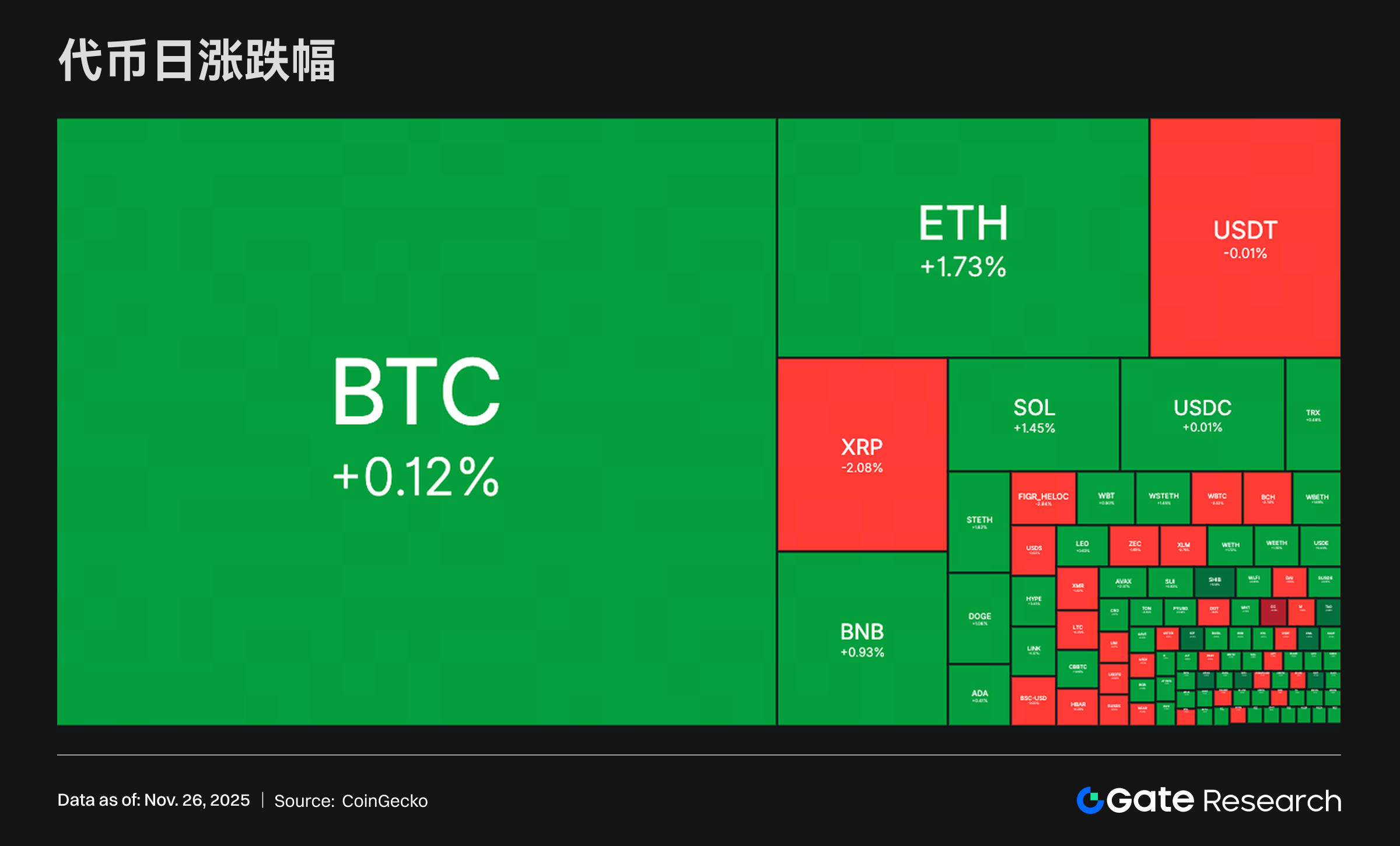 過去24時間、マーケットの感情は依然として慎重であり、恐怖指数は15の極度の恐怖ゾーンに留まっており、投資家のリスク嗜好が引き続き弱まっていることを反映しています。感情が低迷しているにもかかわらず、主流のアルトコインは近くの24時間でわずかに回復しました。その中でSOLは1.26%上昇し、DOGE、ADA、TRXなども0.4%–1%の穏やかな上昇を記録しました。一方、XRPは約2%の小幅な下落を見せ、相対的に弱いパフォーマンスを示しました。全体的に見て、資金は恐怖感の中で選択的に回補を示していますが、勢いは限られており、市場は依然として慎重な揺れ動きの段階にあります。