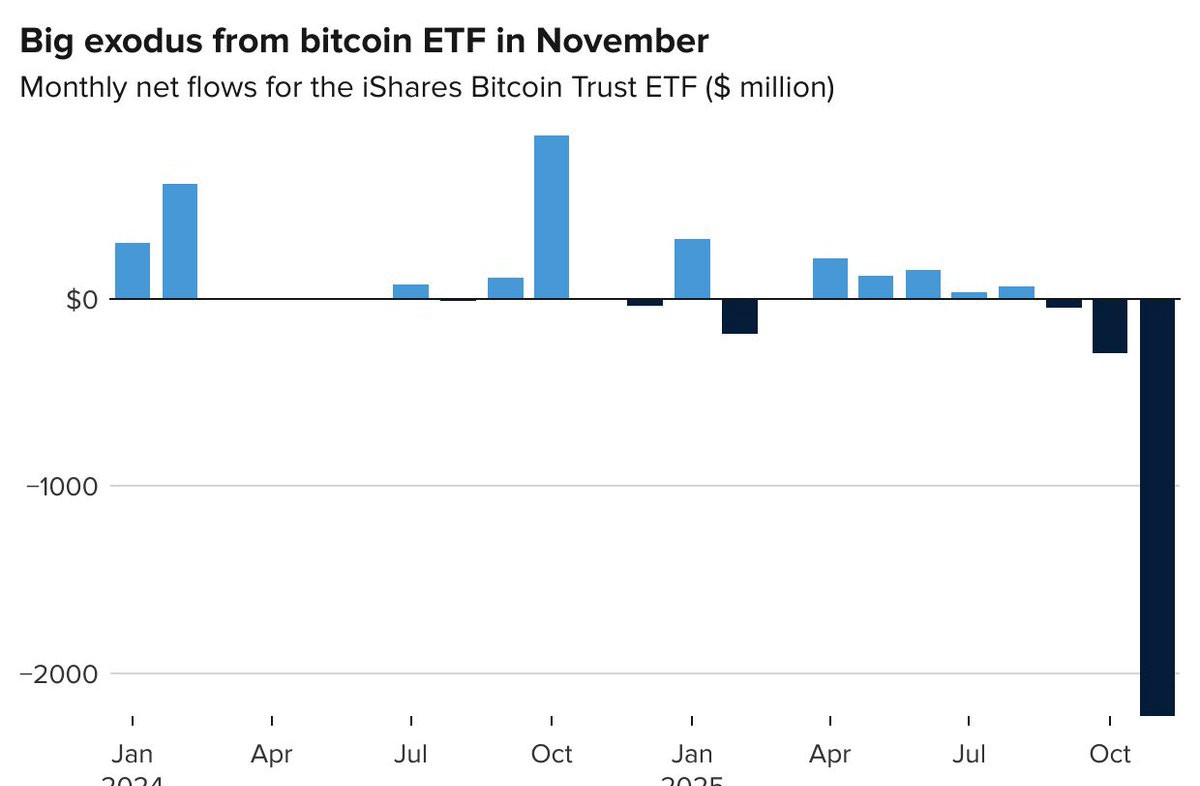2024年の初めから中頃にかけて一貫した成長を遂げ、数ヶ月にわたり強い流入があった後、IBITの勢いは2025年の後半に向けて衰え始めました。10月にはすでに需要が減少していましたが、11月の数字は急激な悪化を示しており、流出が初めて10億ドルの大台を超え、大幅な差でそれを達成しました。