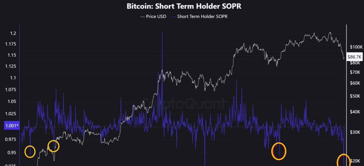 ソース: ETHNews 原題: ビットコインがクラシックなボトムシグナルを示す中、短期ホルダーが capitulate する オリジナルリンク: https://www.ethnews.com/bitcoin-flashes-classic-bottom-signal-as-short-term-holders-capitulate/ ビットコインは、最も信頼できる短期的な底信号の1つを発動しました。新しいCryptoQuantのデータによると、短期保有者SOPR(最近の購入者が利益または損失で売却しているかを追跡する指標)は、11月に0.94に落ち込みました。これは、BTCが80,000ドルから90,000ドルの間で取引されていたにもかかわらずです。