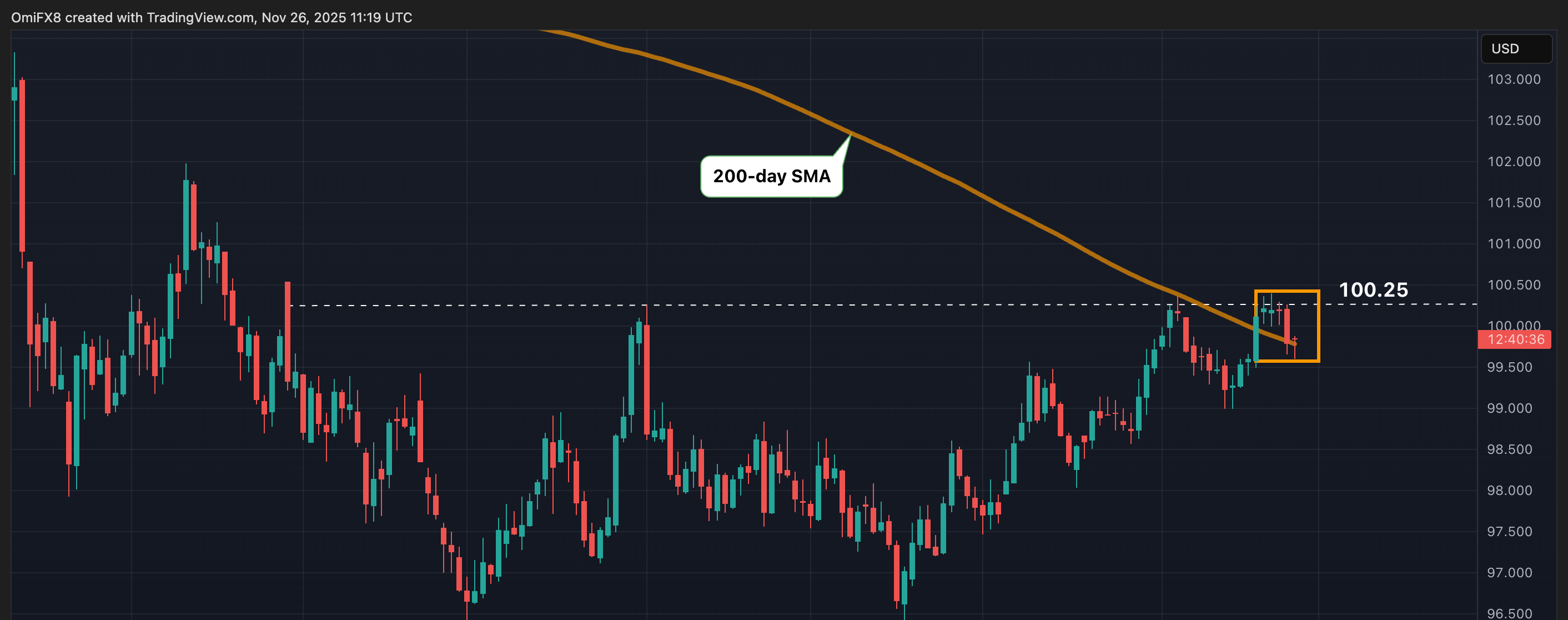 ドルインデックスの日々の価格変動は、ADP雇用統計や12月のFRB利下げの可能性の急上昇を含む、米国経済データの一連の弱さにもかかわらず、インデックスが200日単純移動平均(SMA)の上に足場を築こうとしていることを示しています。これは典型的な強気のシナリオです:悪いニュースを無視する市場は、しばしば大規模なラリーが近づいていることを示しています。
