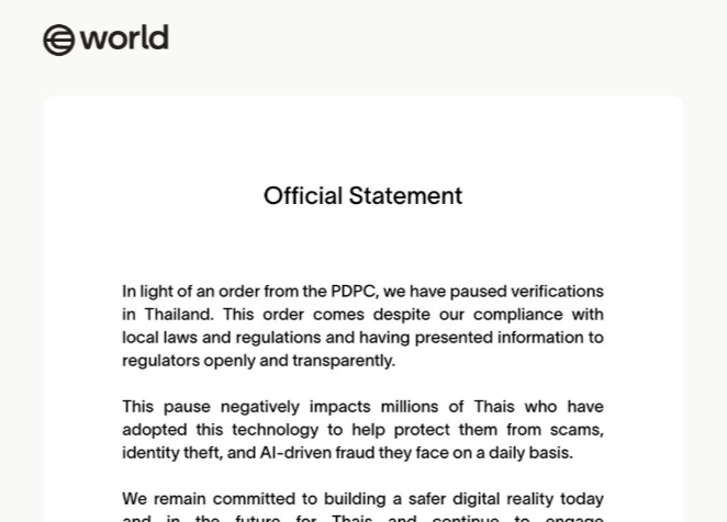 世界のタイは、その停止が何百万ものタイのユーザーに悪影響を及ぼすことを強調しました。これらのユーザーは、詐欺、アイデンティティ盗難、AI駆動の詐欺から自分を守るために、デジタルアイデンティティ技術を採用しています。