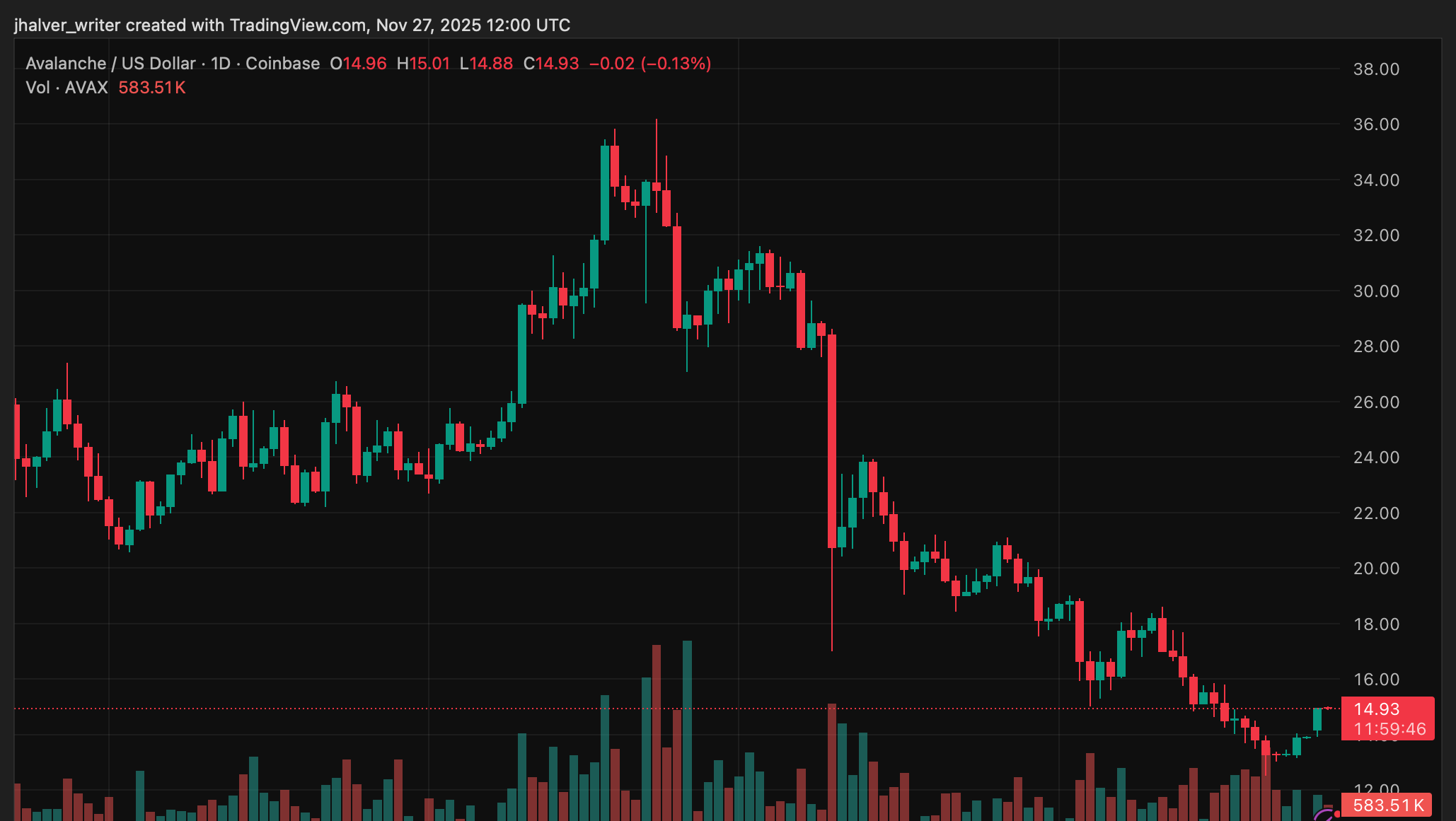 基本面が急上昇する中、AVAXの価格は$12–$15の長期サポートゾーン付近で圧縮されたままです。トークンは最近$14.94に反発し、6.5%の日次上昇を記録し、$13.96の7日移動平均を上回りました。現在、$15.21の20日SMAで抵抗との技術的対決に直面しています。