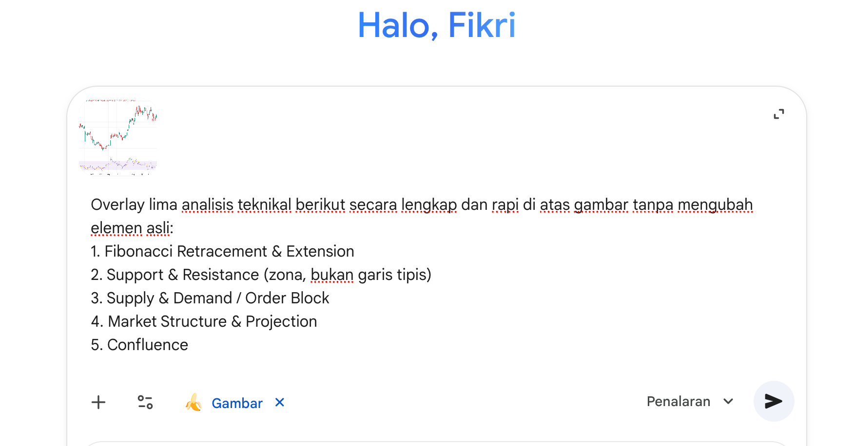出典:TokocryptoBlogオリジナルタイトル:Gemini 3 は今すぐテクニカル分析を直接描画できます。こちらがチュートリアルです!オリジナルリンク: Googleは再びAIの世界で革新をもたらし、Gemini 3の大規模なアップデートを発表しました。このアップデートのまだあまり知られていない機能の一つは、テキストインストラクション(prompt)のみを通じて、テクニカル分析のグラフを自動的に描画する能力です。Gemini 3のチャート分析能力とそれを自動的に画像として表現する機能は、トレーダーや視覚的に価格の動きをより実用的に分析したい初心者投資家にとっての解決策となる可能性があります。## ジェミニ 3 ナノバナナによる自動テクニカル分析画像GeminiのNano Bananaの最新機能により、ユーザーはテクニカル分析を自動的に行い、以前にアップロードされた画像に適用することができます。トレーディングチャートのスクリーンショットを撮り、特定のプロンプトと共にGeminiにアップロードするだけで、直接画像形式で提供される分析を得ることができます。上のチャートの分析は、Geminiによって完全にプロンプト形式のコマンドのみで行われました。結果の分析や提供された画像が完全に正確ではない場合でも、この機能はテクニカルツールに不慣れな初心者や、取引中に別の視点を得たい経験豊富なトレーダーの両方にとって非常に役立ちます。## ジェミニ3を使ったテクニカル分析の方法Geminiを使用して画像をプロンプトするのと同様に、Googleの最新のGemini 3では、Nano Banana機能を使用するだけで、分析結果を直接画像の形で表現できます。以下は完全なチュートリアルです:1. gemini.google.com ページにログインします2. "ツール"を選択し、"画像を作成"をクリックして、バナナのロゴ(ナノバナナ)を作成します。3. 次に、提供するチャートが分析可能であり、将来的に画像として表現できるように、"3 Pro の推論モード"を使用していることを確認してください。4. その後、あなたは希望するタイムフレームに合わせてチャートの画像をアップロードするだけです。以下のプロンプトを使用できます。## テクニカル分析のためのGemini 3のプロンプトの例### プロンプト分析サポート&レジスタンス*"チャート上の主要なサポートとレジスタンスのレベルを特定する際に考慮する:**-- 価格の接触点となることが多いエリア**-- 重要なピークと谷**-- 強力な価格反転ゾーン**そのエリアを横長の長方形の形で視覚化してください:**-- **サポートゾーン** → 薄い緑色の透明を使用し、テキストラベル「サポート」を含めます。表示をクリーンに保つために、最も重要なサポートエリアのみを選択してください。**-- **レジスタンスゾーン** → 薄いピンク色を使用し、テキストラベル「Resistance」を含めます。現在の価格条件に最も関連するレジスタンスに焦点を当ててください。**ゾーンが(の価格範囲を覆うことを確認してください。ただの細いライン)ではなく、薄く、半透明で、整然としているため、元のチャートがはっきりと見えるようにします。*### フィボナッチ、S&R、SND、市場構造、そしてコンフルエンスのプロンプト*"元の要素を変更することなく、以下のテクニカル分析オーバーレイを完全かつ正確に画像に適用してください:**1. フィボナッチリトレースメント & エクステンション**2. サポート & レジスタンス (S& R)**3. 供給と需要 (SND) / オーダーブロック**4. 市場構造 (市場構造) & プロジェクション**5. Confluence (コンフルエンス)**すべての分析が半透明の線で表示され、整然としていて、キャンドルスティック/価格を覆わないようにしてください。分析が一つも残らないように。*### 市場価格の動き分析のためのプロンプト 完全版*"この画像のチャートにおける価格の動きと市場の構造を分析してください。**-- 主なトレンド**-- スイングハイ -- スイングロー**-- 価格反応エリア**-- インパルス -- 修正**分析が完了したら、元の要素を変更、削除、または破壊することなく、次の5つのテクニカル分析をプロフェッショナルに、機能的に、そして整然と画像の上にオーバーレイしてください:**1. フィボナッチリトレースメント & エクステンション**2. サポート & レジスタンス (S&RO1928374656574839201**3. 供給と需要 )SND( / オーダーブロック**4.市場構造と予測**5. コンフルエンス**半透明の線を使い、明確なラベルと正確な配置を行って、キャンドルスティック/価格が見えるようにしてください。すべての分析が漏れなく表示されることを確認してください。*) 需要エリアの分析プロンプトと価格の動き![]###https://img-cdn.gateio.im/social/moments-94b0957073-adcaf34408-153d09-cd5cc0(*"チャート上でコンフルエンスのエリアを特定し、マークします。これは、いくつかのテクニカル要因が交わるポイントです。コンフルエンスを形成する可能性のある組み合わせの例は次のとおりです:**-- フィボナッチレベルがサポート/レジスタンスゾーンと重なる**-- HH/HL/LH/LL* の構造に関連する需給)Order Block(*--