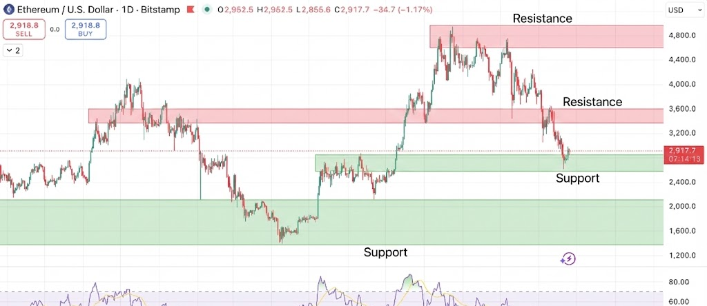 – レジスタンスゾーン → 薄いピンク色を使用し、テキストラベル「Resistance」を含めます。現在の価格条件に最も関連するレジスタンスに焦点を当ててください。