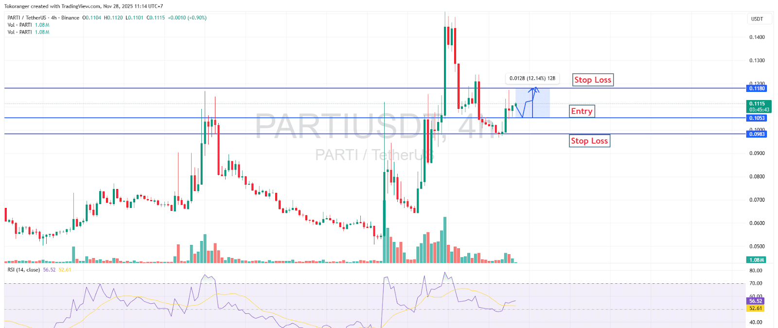 PARTI/USDTは現在、0.1053のサポートエリアで強く耐えた後、リバウンド継続パターンを形成しており、バイヤーが勢いを取り戻し始めていることを示しています。価格はすでにエントリーラインの上に戻り、新たな高値の構造を構築しており、短期的なトレンドが上向きに向かい始めている初期の兆候です。