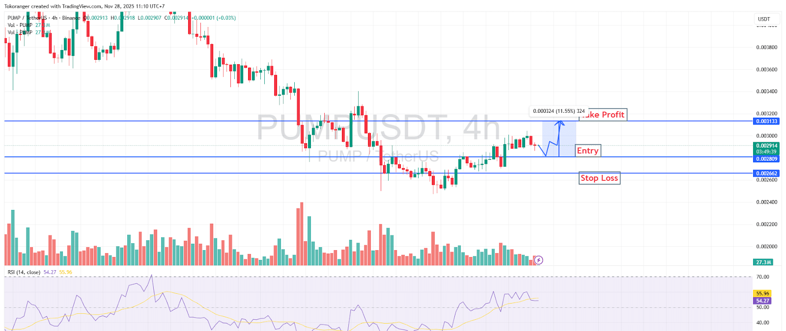 レベル エントリー は 0.00290 の周辺にあり、これは通常短期スイングの推進点となるマイナーサポートのリテストゾーンに正確に位置しています。価格が 0.00266 を下回らない限り、短期的なバイアスは依然としてポジティブです。適切な強化目標は供給エリア 0.00313 にあり、これは以前の統合の上限でもあります。