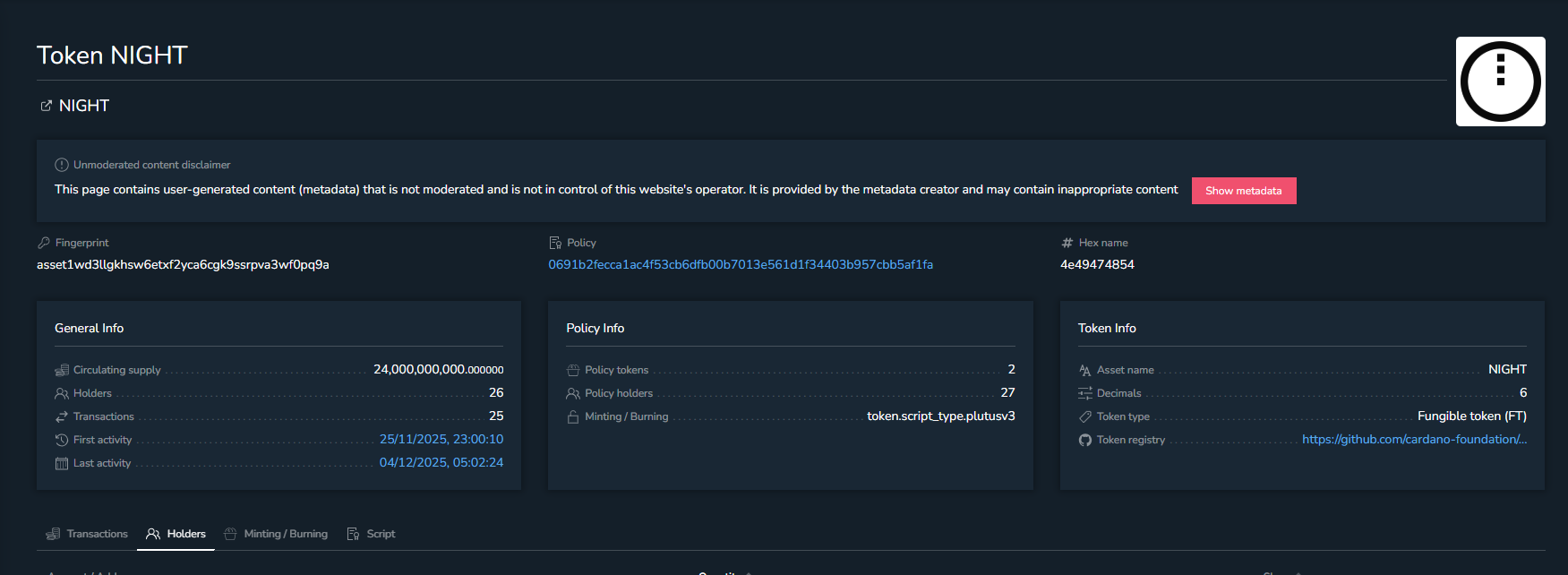 データによると、NIGHTトークンの流通供給量は240億トークンです。Midnightチームは10月14日に初回ミントを、11月25日に最終ミントイベントを実施しました。