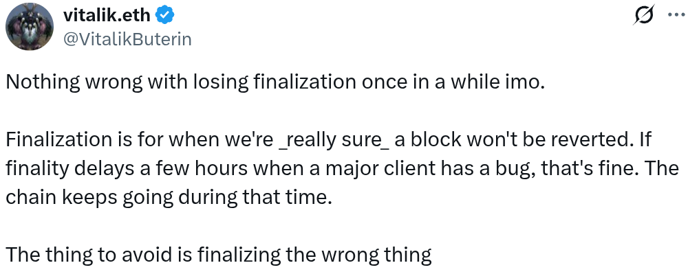 Buterinは、重大なバグにより最終性が時折数時間遅れる場合でも、「それでいい」と主張し、その間もブロックチェーンは動き続けると述べました。彼が本当に懸念しているのは別の問題だと言います:「避けるべきなのは間違ったものを最終化することです。」