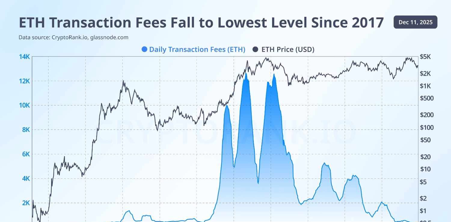 オンチェーン分析のデータによると、日次ガス費用は歴史的範囲の下限付近まで崩壊しており、Ethereumのネットワーク成長初期以来最も急激な料金低下の一つを記録しています。
