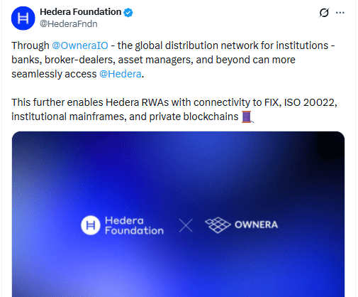 Hedera財団は、金融機関が利用する流通ネットワークであるOwneraと連携し、銀行、ブローカー、資産運用者がHedera上のトークン化されたリアルワールドアセットにアクセスしやすくしました。